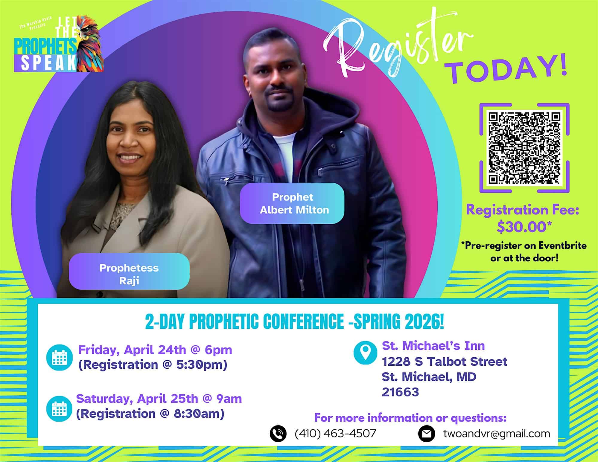 by admin14Feb Let The Prophets Speak at St. Michaels Inn – Saint Michaels, MD Let The Prophets Speak at St. Michaels Inn – Saint Michaels, MD 2 2 people viewed this event. Come hear the wise words and prophecies from our speakers at Let The Prophets Speak – it’s going to be an enlightening event! Tickets-RSVP Link Date And Time Friday, April 24th, 2026 10:00 PM (PST) Venue St. Michaels Inn Location 1228 South Talbot Street, Saint Michaels, MD 21663 Event Types Concert or Performance Event Category Maryland Share With Friends Facebook Twitter Linkedin Xing Pinterest Share This Post:
