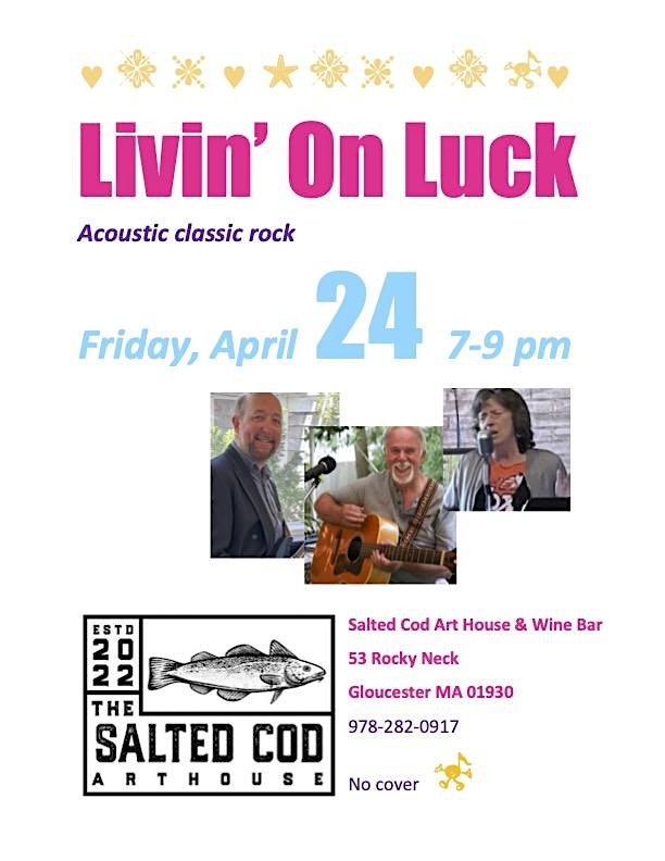 by admin24Feb Livin’ On Luck at The Salted Cod, Gloucester at Salted Cod Arthouse – Gloucester, MA Livin’ On Luck at The Salted Cod, Gloucester at Salted Cod Arthouse – Gloucester, MA 1 1 people viewed this event. Livin’ On Luck returns to the Salted Cod playing acoustic covers of classic rock and pop Tickets-RSVP Link Date And Time Friday, April 24th, 2026 07:00 PM (PST) Venue Salted Cod Arthouse Location 53 Rocky Neck Avenue, Gloucester, MA 1930 Event Types Concert or PerformanceFood & Drink Event Category Massachusetts Share With Friends Facebook Twitter Linkedin Xing Pinterest Share This Post: