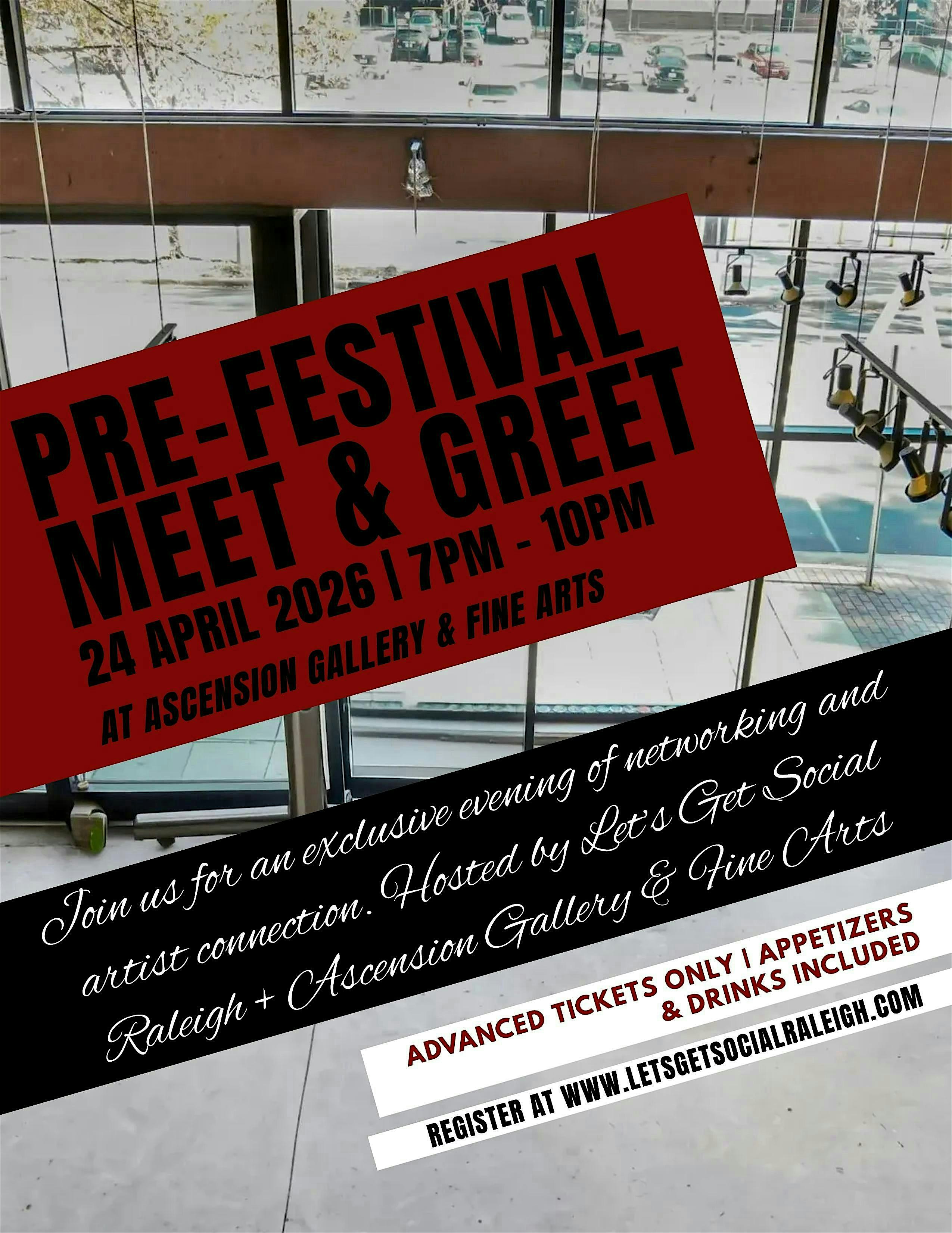by admin13Feb Pre-Festival Meet & Greet at Ascension Art Gallery at The Ascension Art Gallery – Raleigh, NC Pre-Festival Meet & Greet at Ascension Art Gallery at The Ascension Art Gallery – Raleigh, NC 2 2 people viewed this event. Kick off the festival in an exclusive, modern, arts-forward space curated for connection, culture, and elevated vibes. Tickets-RSVP Link Date And Time Friday, April 24th, 2026 11:00 PM (PST) Venue The Ascension Art Gallery Location 416 South McDowell Street, Raleigh, NC 27601 Event Types Community & CultureParty or Social Gathering Event Category North CarolinaRaleigh Share With Friends Facebook Twitter Linkedin Xing Pinterest Share This Post: