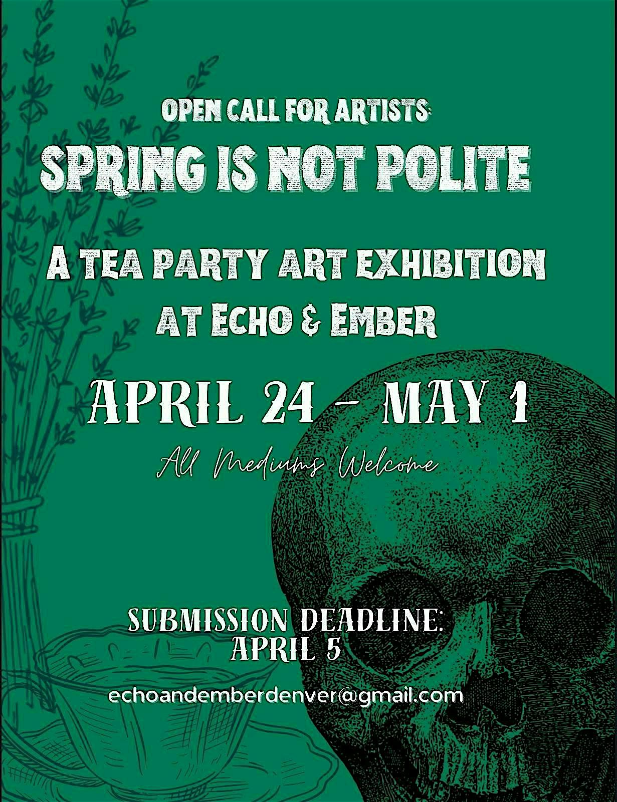 by admin27Feb Spring is not Polite – A Tea Party Art Exhibition at 3195 Blake St #101 – Denver, CO Spring is not Polite – A Tea Party Art Exhibition at 3195 Blake St #101 – Denver, CO 2 2 people viewed this event. Celebrate local art, connection, and creativity at this week-long exhibition with an opening reception and First Friday finale. Tickets-RSVP Link Date And Time Friday, April 24th, 2026 @ 06:00 PM Location 3195 Blake Street, Denver, CO 80205 Event Types Party or Social GatheringPerforming & Visual Arts Event Category ColoradoDenver Share With Friends Facebook Twitter Linkedin Xing Pinterest Share This Post: