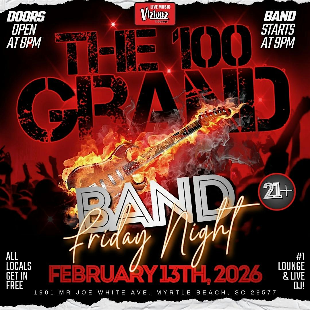 by admin24Feb The 100 Grand Band at Vizionz Lounge and Live Music Bar – Myrtle Beach, SC The 100 Grand Band at Vizionz Lounge and Live Music Bar – Myrtle Beach, SC 3 3 people viewed this event. Get ready to rock out with The 100 Grand Band, a high-energy show guaranteed to have you dancing all night long! Tickets-RSVP Link Date And Time Friday, April 24th, 2026 08:00 PM (PST) Venue Vizionz Lounge and Live Music Bar Location 1901 Mr. Joe White Avenue, Myrtle Beach, SC 29577 Event Types Concert or PerformanceMusic Event Category Myrtle BeachSouth Carolina Share With Friends Facebook Twitter Linkedin Xing Pinterest Share This Post: