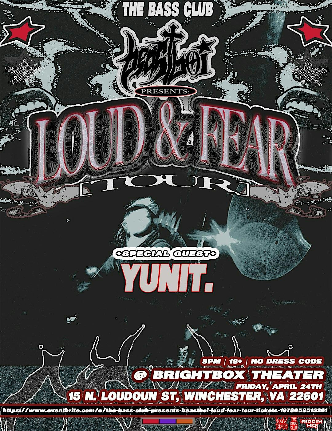 by admin24Feb The Bass Club Presents: beastboi LOUD & FEAR TOUR at Bright Box Theater – Winchester, VA The Bass Club Presents: beastboi LOUD & FEAR TOUR at Bright Box Theater – Winchester, VA 2 2 people viewed this event. We’re back for another epic night of Riddim at Bright Box Theater! Event is 18+. Advance tickets are strongly recommended. Tickets-RSVP Link Date And Time Friday, April 24th, 2026 08:00 PM (PST) Venue Bright Box Theater Location 15 North Loudoun Street, Winchester, VA 22601 Event Types Concert or PerformanceMusic Event Category Virginia Share With Friends Facebook Twitter Linkedin Xing Pinterest Share This Post: