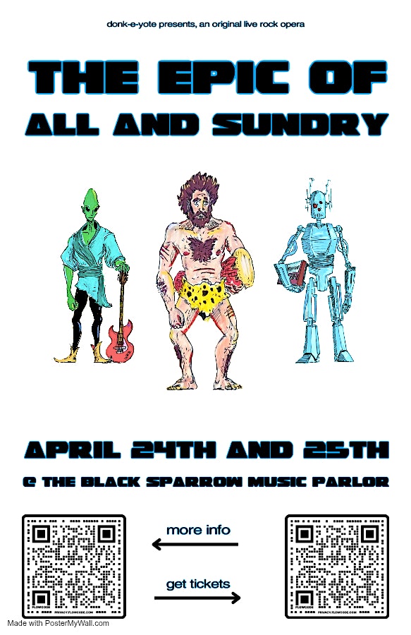 Welcome to the **Black Sparrow Music Parlor** for a night of epic proportions with **The Epic Of All And Sundry** rock opera! Get ready to be blown away on April 24, 2026 at 7:30 PM (Central Time). This is not your average show – it’s a musical journey that will leave you speechless. Mark your calendars and get ready to rock out at the Black Sparrow Music Parlor!