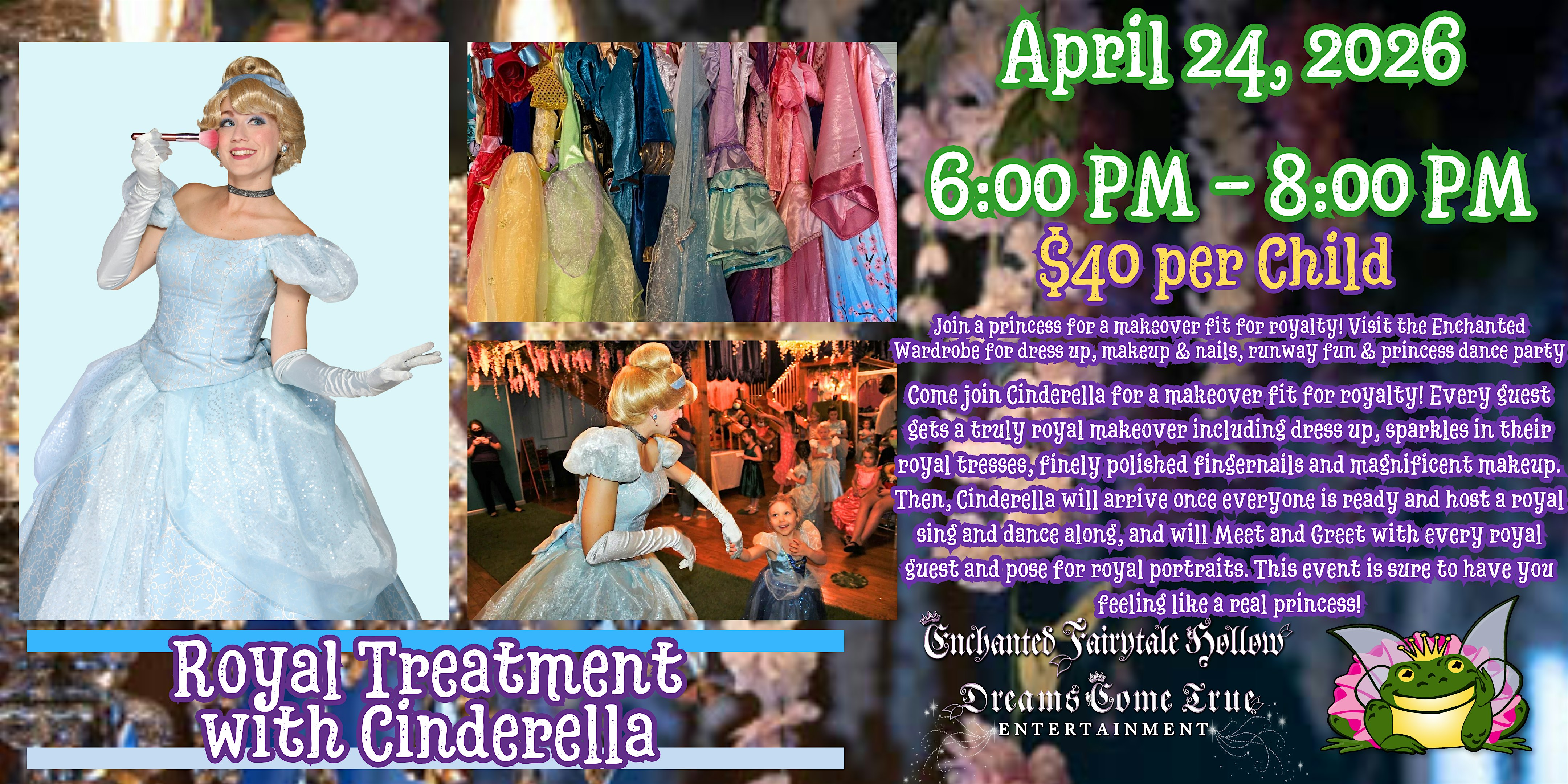 by admin24Feb The Royal Treatment with Cinderella at Enchanted Fairytale Hollow – Lakeland, FL The Royal Treatment with Cinderella at Enchanted Fairytale Hollow – Lakeland, FL 5 5 people viewed this event. Join a princess for a makeover fit for royalty! Visit the Enchanted Wardrobe for dress up, makeup & nails, runway fun & princess dance party Tickets-RSVP Link Date And Time Friday, April 24th, 2026 @ 06:00 PM Location 818 E Lemon Street, Lakeland, FL 33801 Event Types Party or Social Gathering Event Category Florida Share With Friends Facebook Twitter Linkedin Xing Pinterest Share This Post: