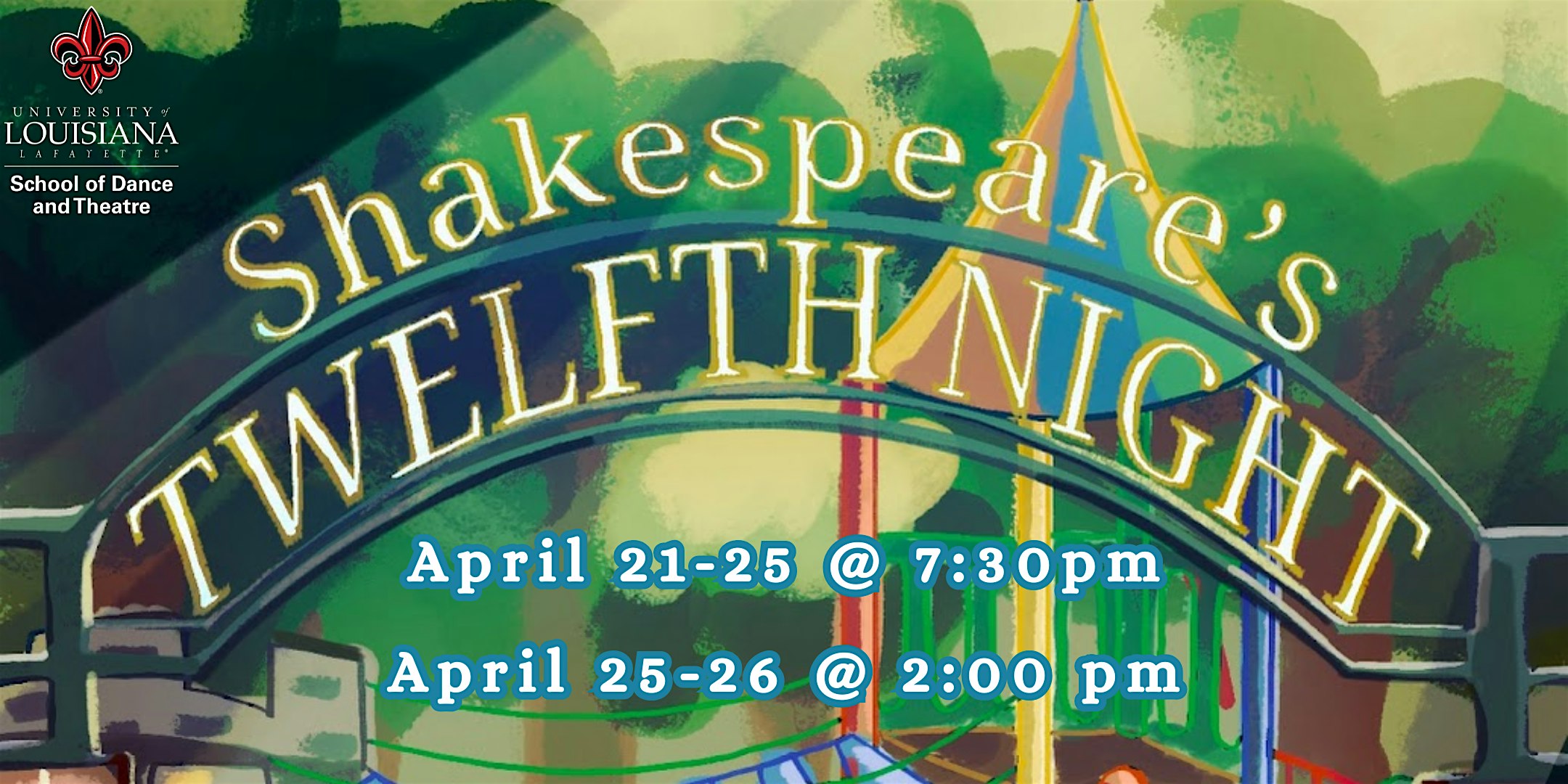 TWELFTH NIGHT – SCHOOL OF DANCE AND THEATRE at Burke-Hawthorne Hall Theatre – Lafayette, LA TWELFTH NIGHT – SCHOOL OF DANCE AND THEATRE at Burke-Hawthorne Hall Theatre – Lafayette, LA 3 3 people viewed this event. The chaos of Shakespeare’s Twelfth Night with a twist! The city of Illyria now reimagined as a park, and the characters we love are at play. Tickets-RSVP Link Register for event Date And Time Friday, April 24th, 2026 @ 07:00 PM Location 231 HEBRARD BLVD, Lafayette, LA 70503 Event Types Concert or PerformancePerforming & Visual Arts Event Category Louisiana Share With Friends Facebook Twitter Linkedin Xing Pinterest