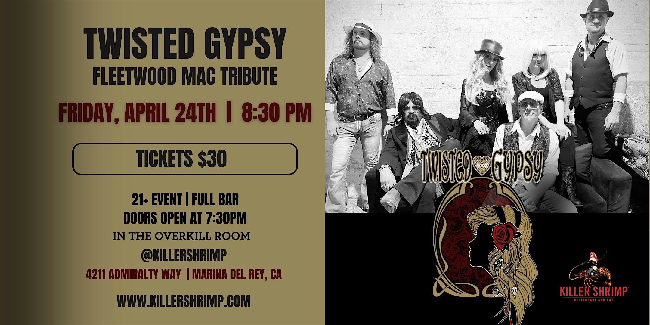 by admin24Feb Twisted Gypsy at Killer Yacht Club Overkill 4/24/26 at 4211 Admiralty Way, Marina del Rey, CA, USA – Marina del Rey, CA Twisted Gypsy at Killer Yacht Club Overkill 4/24/26 at 4211 Admiralty Way, Marina del Rey, CA, USA – Marina del Rey, CA 1 1 people viewed this event. Join Twisted Gypsy for a high-energy Fleetwood Mac tribute at Killer Shrimp with great music, cocktails, and waterfront views! Tickets-RSVP Link Date And Time Friday, April 24th, 2026 08:00 PM (PST) Venue 4211 Admiralty Way, Marina del Rey, CA, USA Location 4211 Admiralty Way, Marina del Rey, CA 90292 Event Types Concert or PerformanceMusic Event Category California Share With Friends Facebook Twitter Linkedin Xing Pinterest Share This Post: