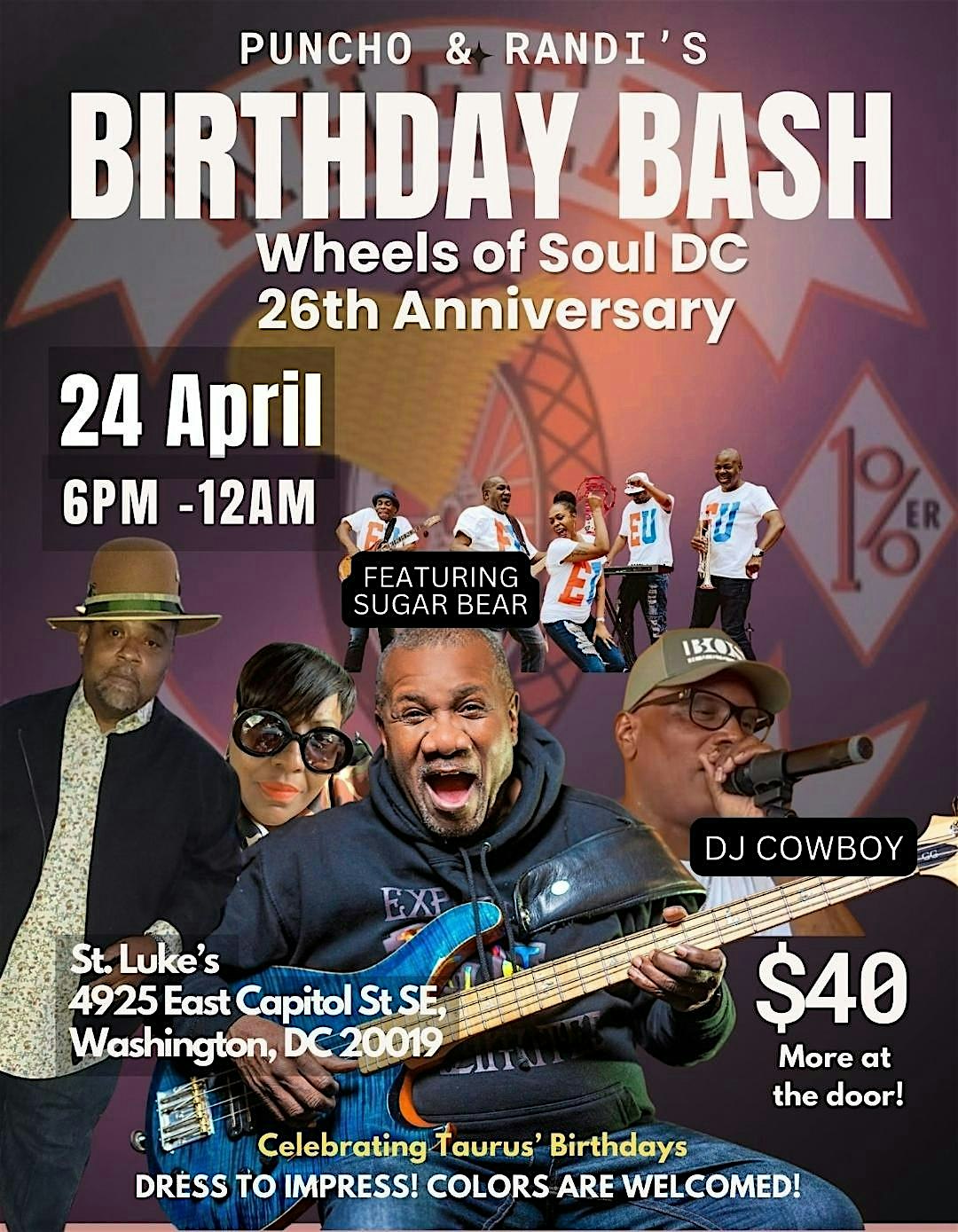 by admin27Feb WHEELS OF SOUL DC CHAPTER 26th ANNIVERSARY/ Puncho & Miranda Birthday Party at 4923 East Capitol St SE – Washington, DC WHEELS OF SOUL DC CHAPTER 26th ANNIVERSARY/ Puncho & Miranda Birthday Party at 4923 East Capitol St SE – Washington, DC 2 2 people viewed this event. EU Featuring Sugar Bear and DJ Cowboy Tickets-RSVP Link Date And Time Friday, April 24th, 2026 @ 06:00 PM Location 4923 East Capitol Street Southeast, Washington, DC 20019 Event Types MusicParty or Social Gathering Event Category Washington DC Share With Friends Facebook Twitter Linkedin Xing Pinterest Share This Post:
