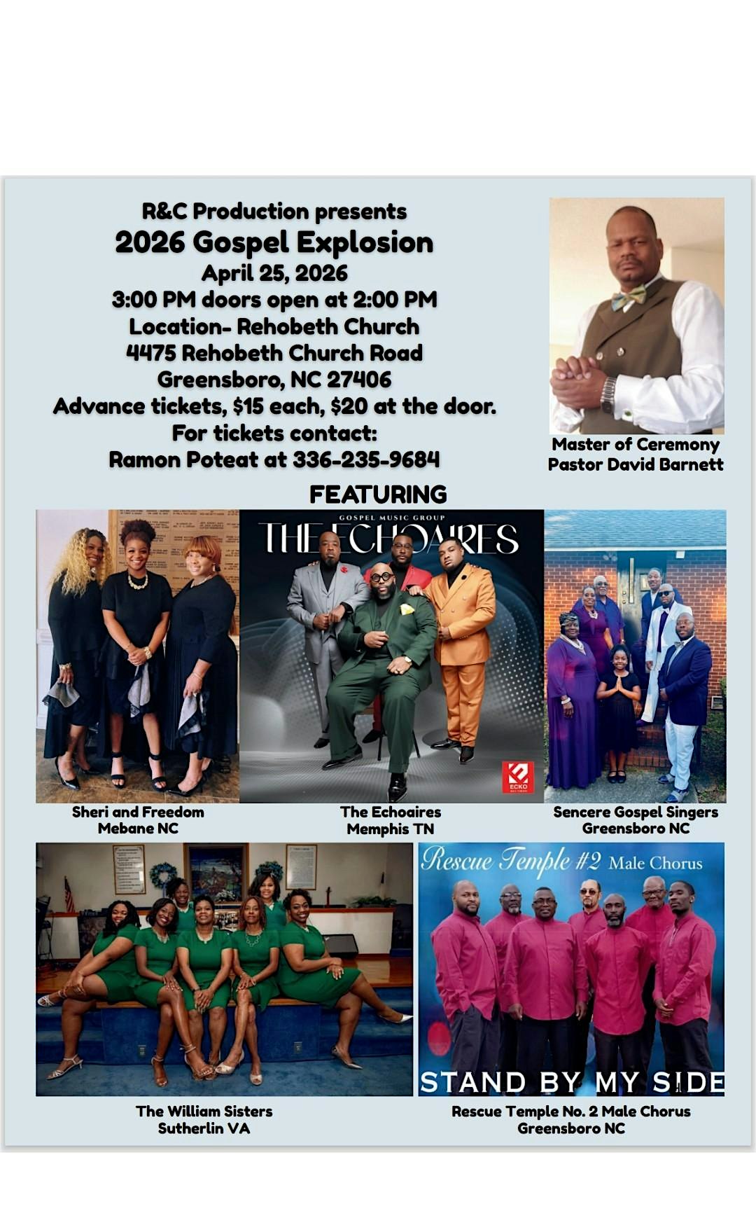 by admin13Feb 2026 Gospel Explosion at 4475 Rehobeth Church Rd – Greensboro, NC 2026 Gospel Explosion at 4475 Rehobeth Church Rd – Greensboro, NC 2 2 people viewed this event. Get ready to vibe and uplift your soul at the 2026 Gospel Explosion – an epic in-person praise party! Tickets-RSVP Link Date And Time Saturday, April 25th, 2026 07:00 PM (PST) Venue 4475 Rehobeth Church Rd Location 4475 Rehobeth Church Road, Greensboro, NC 27406 Event Types Concert or PerformanceMusic Event Category GreensboroNorth Carolina Share With Friends Facebook Twitter Linkedin Xing Pinterest Share This Post: