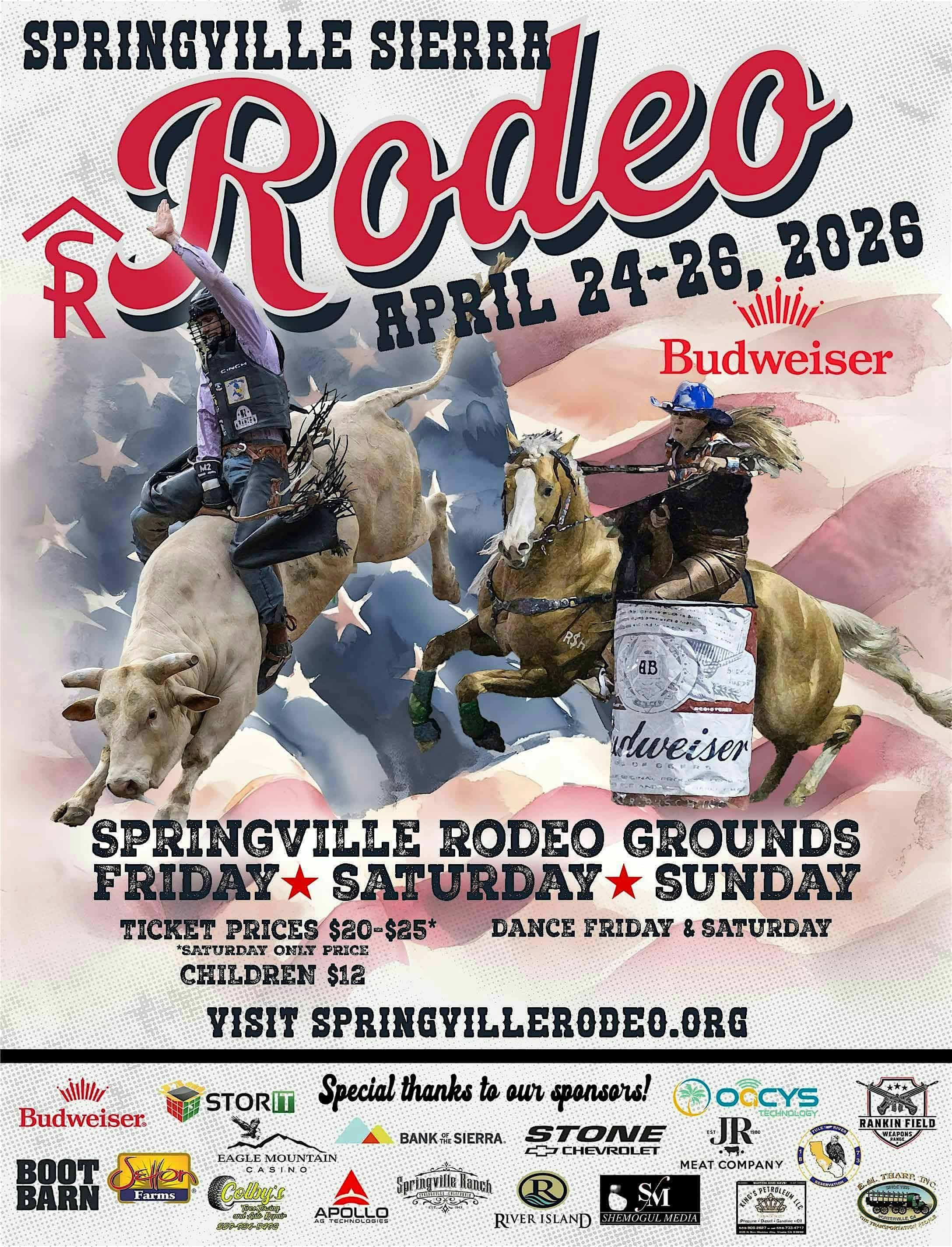 Experience the 76th Springville Rodeo April 24–26, 2026! Three nights of pro rodeo action, family fun, food, and American tradition.