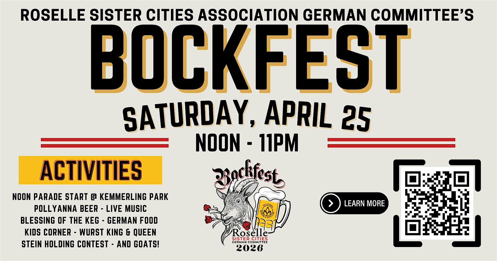 by admin24Feb 5th Annual Bockfest at Pollyanna Brewing Company – Roselare – Roselle, IL 5th Annual Bockfest at Pollyanna Brewing Company – Roselare – Roselle, IL 1 1 people viewed this event. Join us for our Bockfest event on Saturday, April 25 at 12:00 pm at Pollyanna in Roselle, IL for German food, live music, and games! Tickets-RSVP Link Date And Time Saturday, April 25th, 2026 12:00 PM (PST) Venue Pollyanna Brewing Company - Roselare Location 245 E Main Street, Roselle, IL 60172 Event Types Festival or FairFood & Drink Event Category Illinois Share With Friends Facebook Twitter Linkedin Xing Pinterest Share This Post: