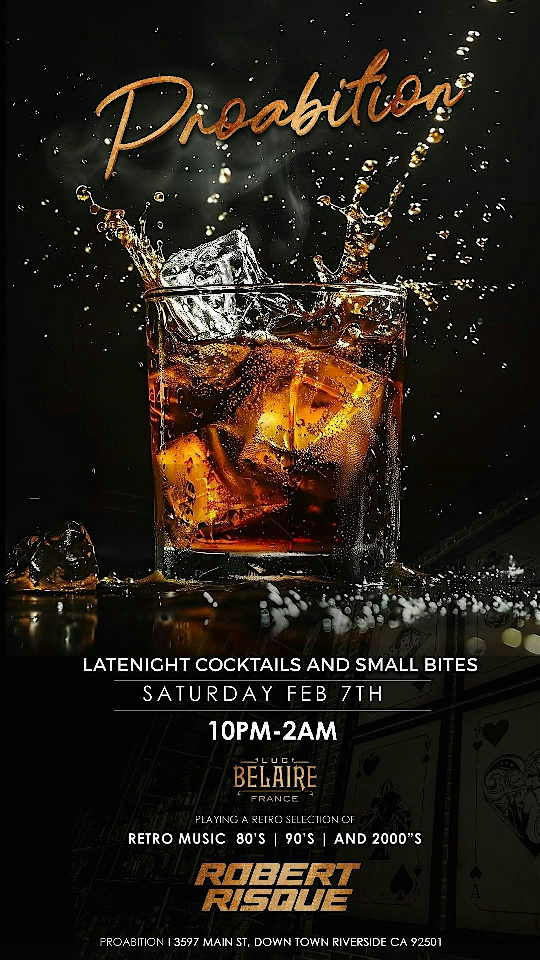 by admin27Feb 80’s & 90’s Saturdays at ProAbition Whiskey Lounge & Kitchen – Riverside, CA 80’s & 90’s Saturdays at ProAbition Whiskey Lounge & Kitchen – Riverside, CA 2 2 people viewed this event. Enjoy late-night dining, creative cocktails, and nostalgic 80s–90s vibes every Saturday night. Perfect for friends, family, or date night. Tickets-RSVP Link Date And Time Saturday, April 25th, 2026 @ 09:00 PM Location 3597 Main Street, Riverside, CA 92501 Event Types MusicParty or Social Gathering Event Category California Share With Friends Facebook Twitter Linkedin Xing Pinterest Share This Post: