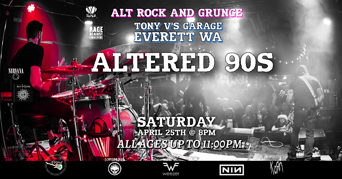 by admin24Feb Altered 90’s at Tony V’s at Tony V’s Garage – Everett, WA Altered 90’s at Tony V’s at Tony V’s Garage – Everett, WA 1 1 people viewed this event. Get ready to vibe with reimagined 90’s beats and good times at Tony V’s—nostalgia with a twist! Tickets-RSVP Link Date And Time Saturday, April 25th, 2026 08:00 PM (PST) Venue Tony V's Garage Location 1716 Hewitt Avenue, Everett, WA 98201 Event Types Concert or PerformanceMusic Event Category Washington Share With Friends Facebook Twitter Linkedin Xing Pinterest Share This Post:
