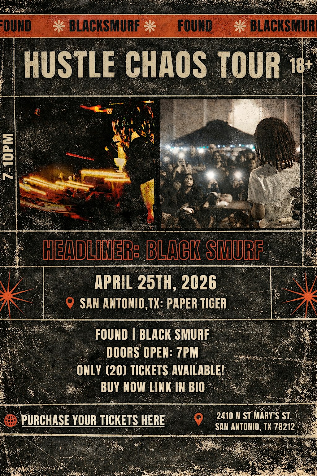 by admin24Feb APRIL 25th: Black Smurf | Found Live in San Antonio, TX [READ DESC] at Paper Tiger – San Antonio, TX APRIL 25th: Black Smurf | Found Live in San Antonio, TX [READ DESC] at Paper Tiger – San Antonio, TX 1 1 people viewed this event. You will NOT be using and QR code / any digital code to enter. ensure your First and Last name is correct, you would provide this at entry Tickets-RSVP Link Date And Time Saturday, April 25th, 2026 07:00 PM (PST) Venue Paper Tiger Location 2410 North Saint Mary's Street, San Antonio, TX 78212 Event Types Music Event Category San AntonioTexas Share With Friends Facebook Twitter Linkedin Xing Pinterest Share This Post: