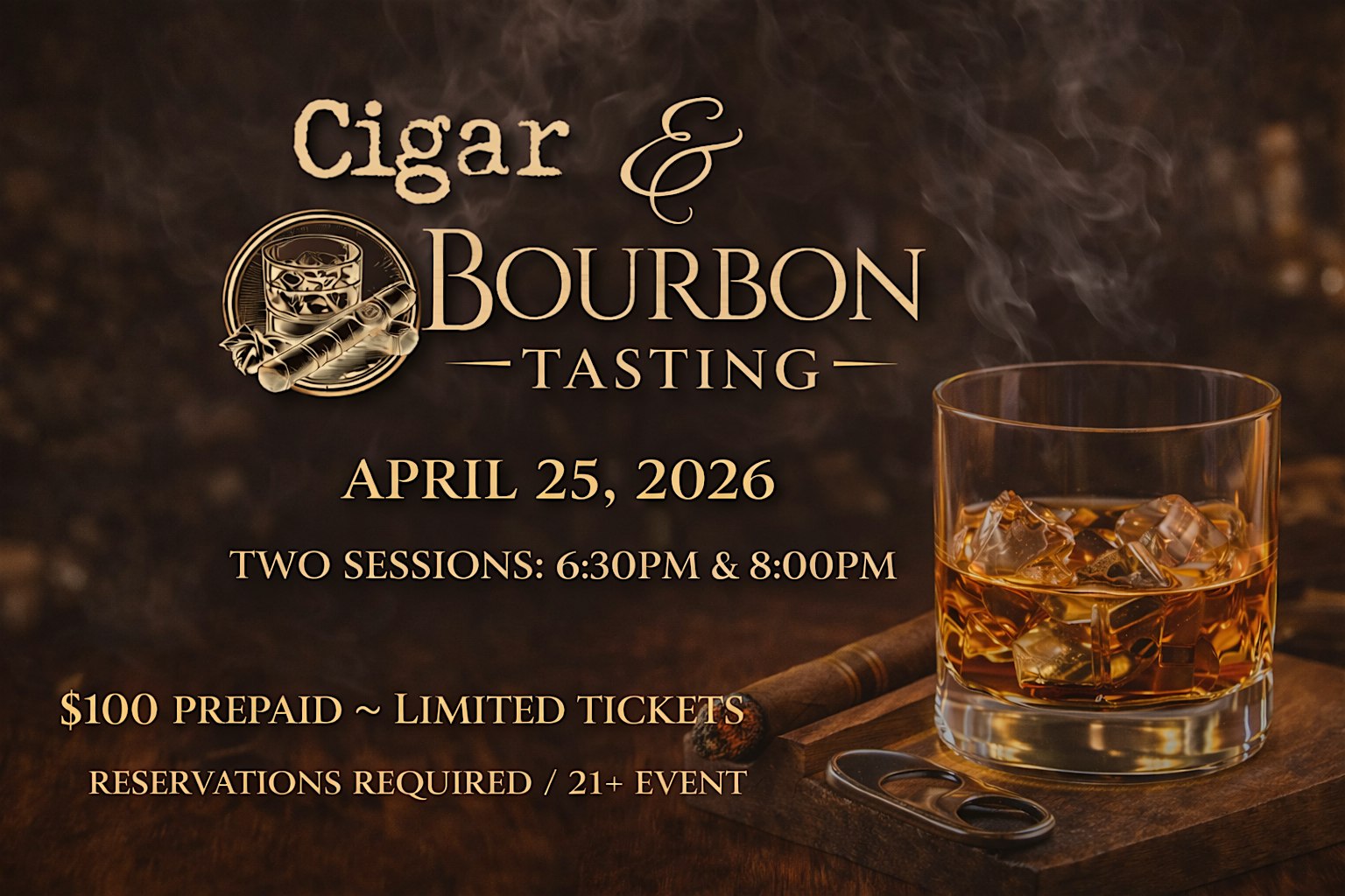 Indulge in the rich flavors of premium bourbon and handcrafted cigars in a vintage, upscale setting. Whether you’re a seasoned connoisseur or just beginning your journey, this night promises an elevated experience.