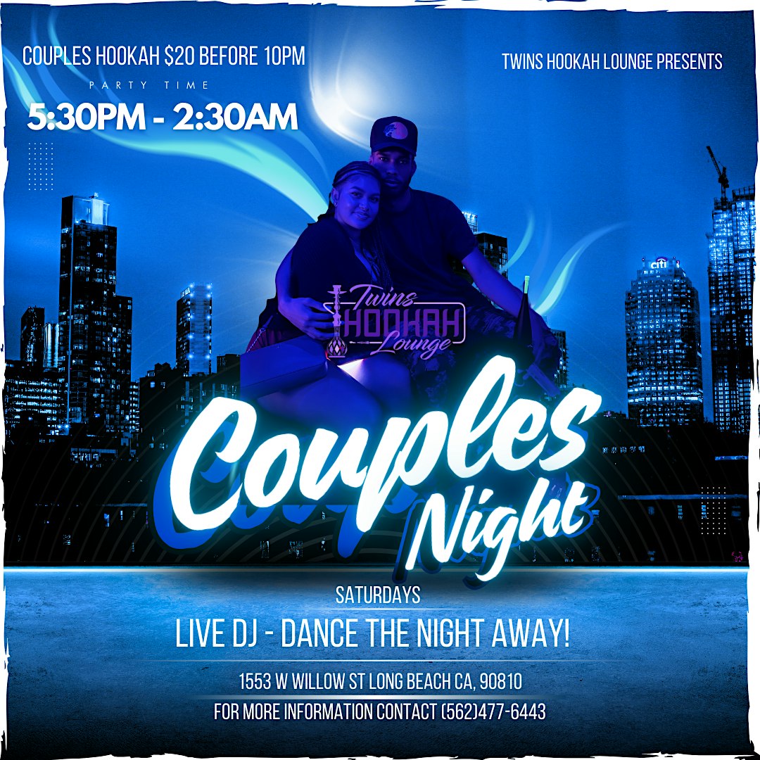 by admin27Feb Couples Night! at Twins Hookah Lounge – Long Beach, CA Couples Night! at Twins Hookah Lounge – Long Beach, CA 2 2 people viewed this event. Come join us for a fun night out with your significant other at “Couples Night!” – a perfect date night filled with love and laughter! Tickets-RSVP Link Date And Time Saturday, April 25th, 2026 @ 05:00 PM Location 1553 West Willow Street, Long Beach, CA 90810 Event Types MusicParty or Social Gathering Event Category CaliforniaLong Beach Share With Friends Facebook Twitter Linkedin Xing Pinterest Share This Post: