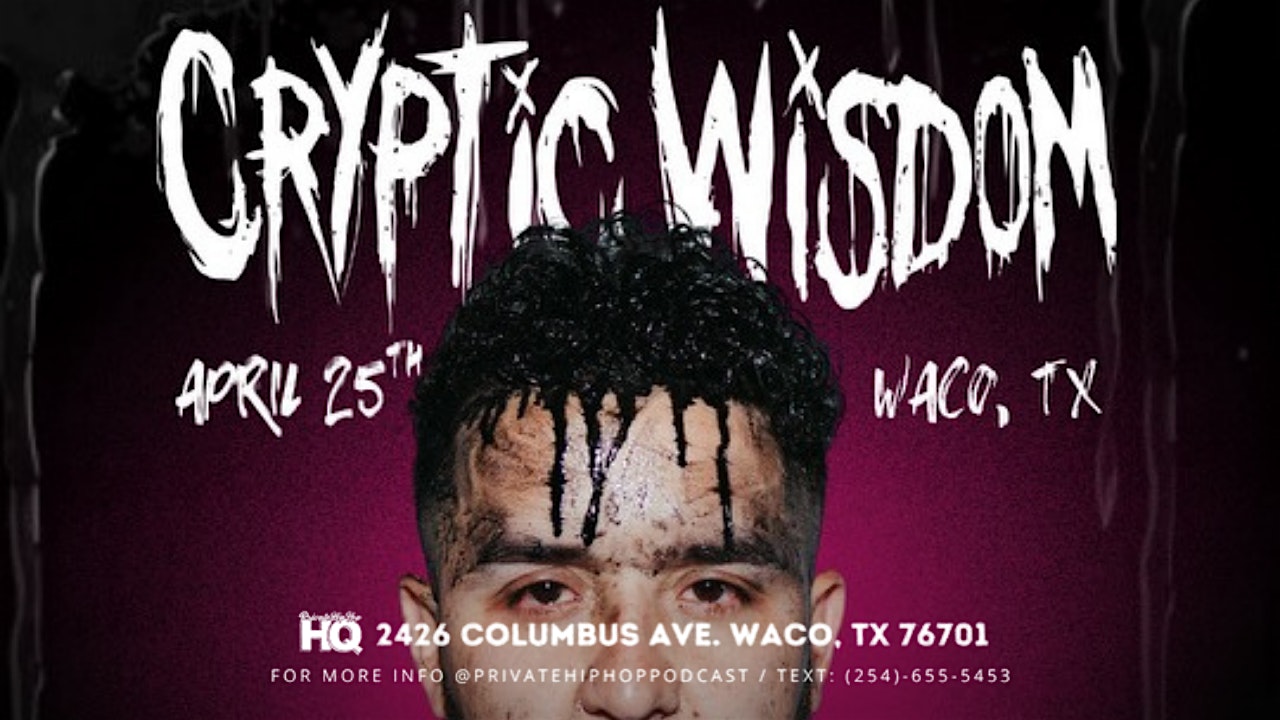 by admin24Feb Cryptic Wisdom – Music that Bleeds! at Private Hip-Hop HQ – Waco, TX Cryptic Wisdom – Music that Bleeds! at Private Hip-Hop HQ – Waco, TX 2 2 people viewed this event. All the way from Arizona, Cryptic Wisdom is bringing a high energy to TX, accompanied by Waco based rock band DogBite, its about to go UP! Tickets-RSVP Link Date And Time Saturday, April 25th, 2026 08:00 PM (PST) Venue Private Hip-Hop HQ Location 2426 Columbus Avenue, Waco, TX 76701 Event Types Concert or PerformanceMusic Event Category TexasWaco Share With Friends Facebook Twitter Linkedin Xing Pinterest Share This Post: