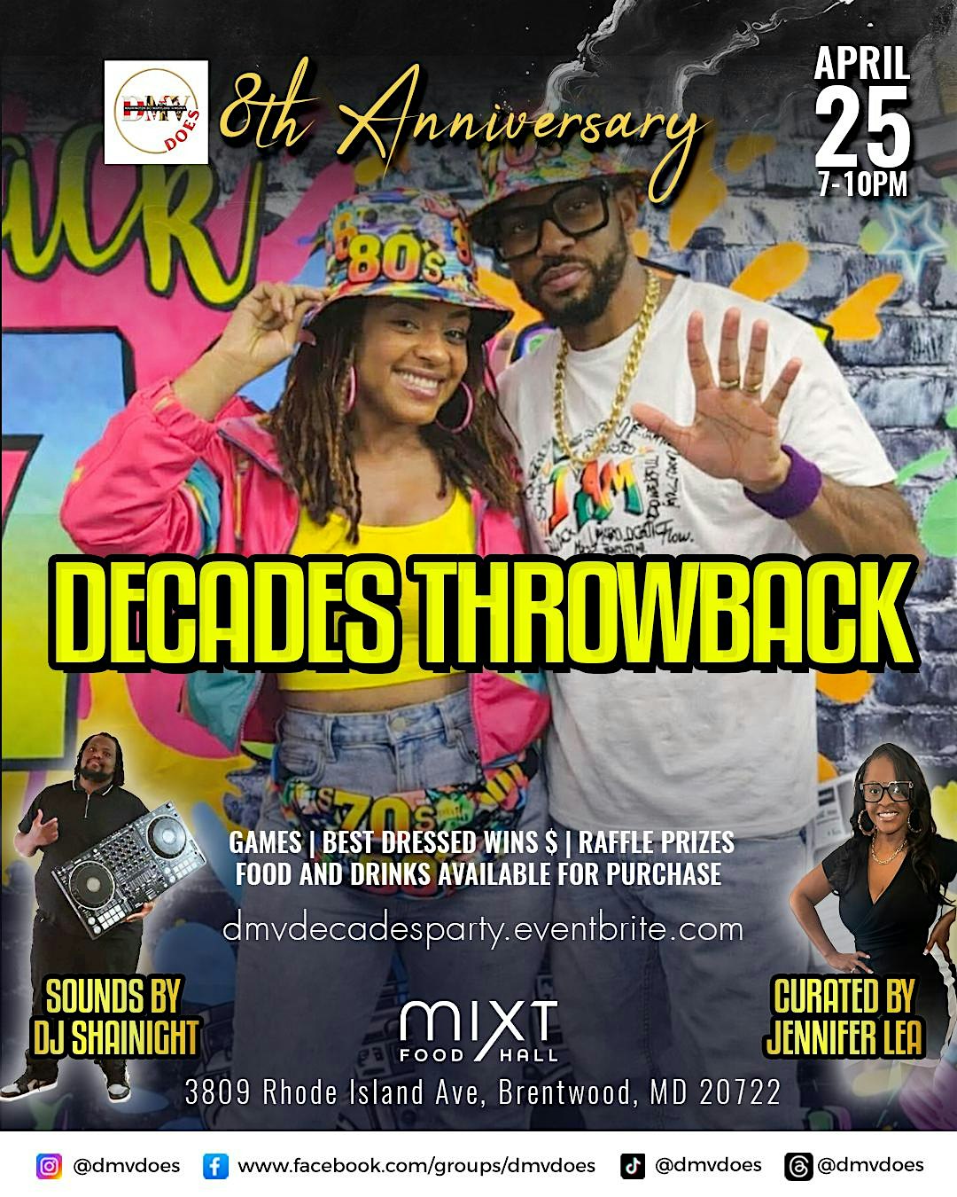 Throw it Back at DMV Does’ 8th Anniversary: Decades Throwback! enjoy connections, music, games, vendors.