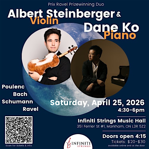 by admin13Feb Duo Violin and Piano: Albert Steinberger & Dane Ko at Infiniti Strings – Markham, Canada Duo Violin and Piano: Albert Steinberger & Dane Ko at Infiniti Strings – Markham, Canada 2 2 people viewed this event. Formed in Fontainebleau, the duo makes their Canadian debut with a program including their prize-winning interpretation of Ravel “Blues” Tickets-RSVP Link Date And Time Saturday, April 25th, 2026 08:00 PM (PST) Venue Infiniti Strings Location 351 Ferrier Street, Markham, Canada L3R 5Z2 Event Types Concert or PerformanceMusic Event Category Canada Share With Friends Facebook Twitter Linkedin Xing Pinterest Share This Post: