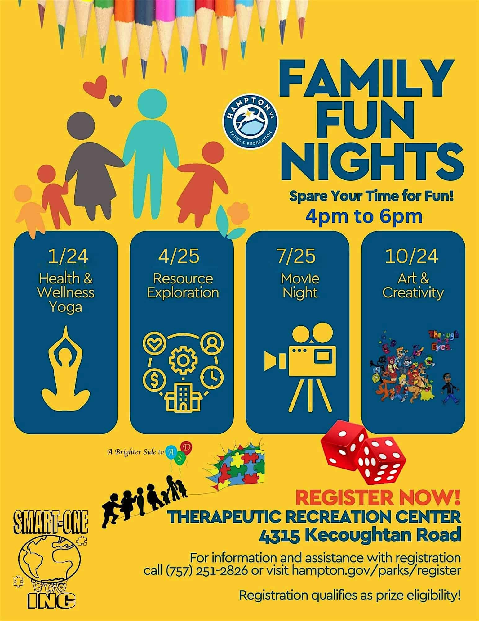 by admin24Feb Family Fun Nights at Therapeutic Recreation Center – Hampton, VA Family Fun Nights at Therapeutic Recreation Center – Hampton, VA 2 2 people viewed this event. Come enjoy a day of fun with the family enjoying games, raffles, light food and refreshments and access to service providers and vendors. Tickets-RSVP Link Date And Time Saturday, April 25th, 2026 04:00 PM (PST) Venue Therapeutic Recreation Center Location 4315 Kecoughtan Road, Hampton, VA 23669 Event Types Party or Social Gathering Event Category Virginia Share With Friends Facebook Twitter Linkedin Xing Pinterest Share This Post: