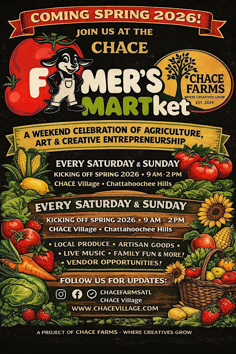 by admin24Feb Farmer’s mARTket at CHACE Village – Fairburn, GA Farmer’s mARTket at CHACE Village – Fairburn, GA 1 1 people viewed this event. A new, weekend marketplace at CHACE Village featuring fresh food, local art, music, and community. All rooted in land and culture. Tickets-RSVP Link Date And Time Saturday, April 25th, 2026 09:00 AM (PST) Venue CHACE Village Location 10235 RiverTown Road, Fairburn, GA 30213 Event Types Food & Drink Event Category Georgia Share With Friends Facebook Twitter Linkedin Xing Pinterest Share This Post: