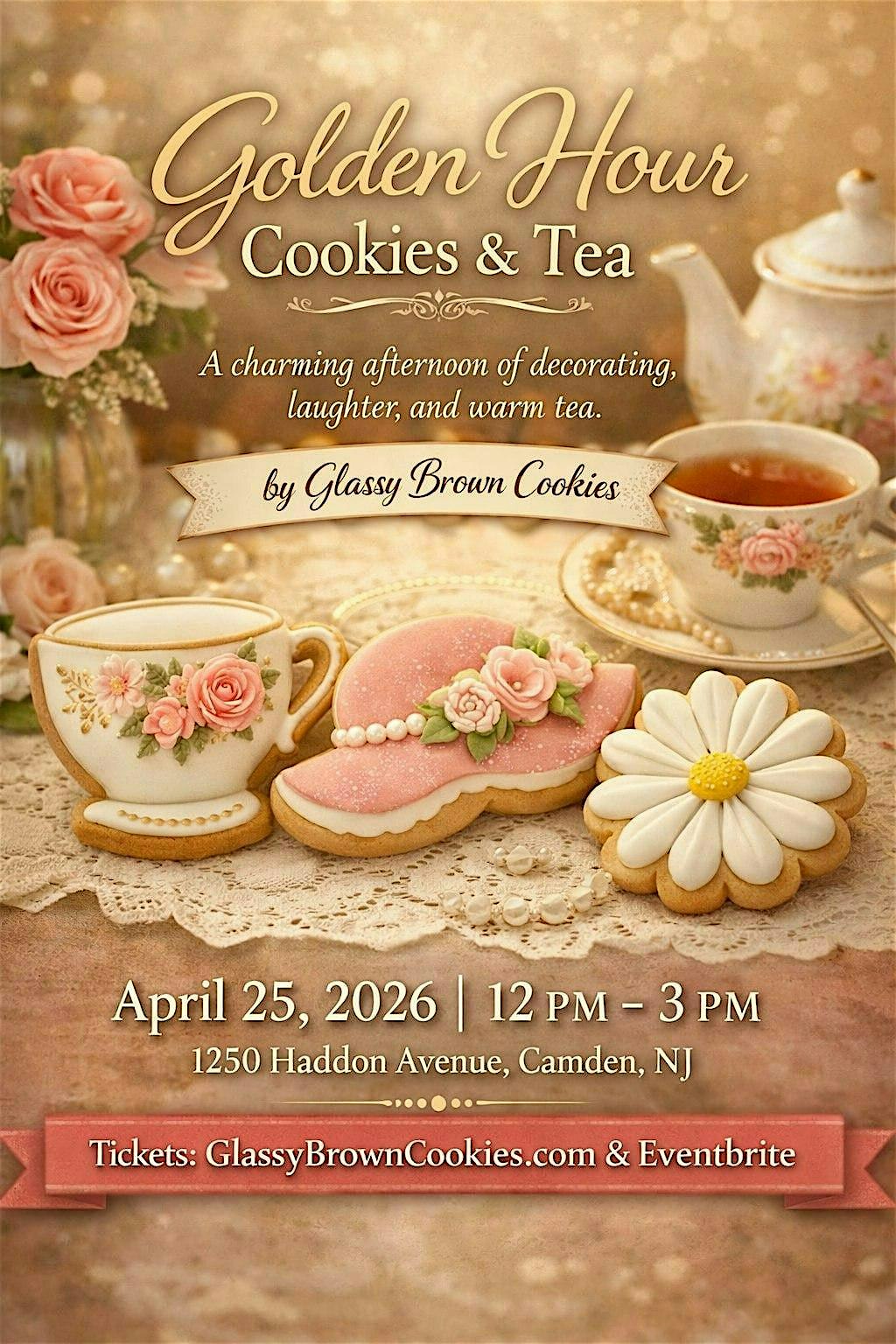 by admin27Feb Golden Hour Cookies & Tea at 1250 Haddon Ave – Camden, NJ Golden Hour Cookies & Tea at 1250 Haddon Ave – Camden, NJ 2 2 people viewed this event. Sip tea, decorate floral cookies, and enjoy a relaxing afternoon of laughter and creativity at Golden Hour Cookies & Tea. ☕ Tickets-RSVP Link Date And Time Saturday, April 25th, 2026 @ 12:00 PM Location 1250 Haddon Avenue, Camden, NJ 8103 Event Types Food & DrinkParty or Social Gathering Event Category New Jersey Share With Friends Facebook Twitter Linkedin Xing Pinterest Share This Post: