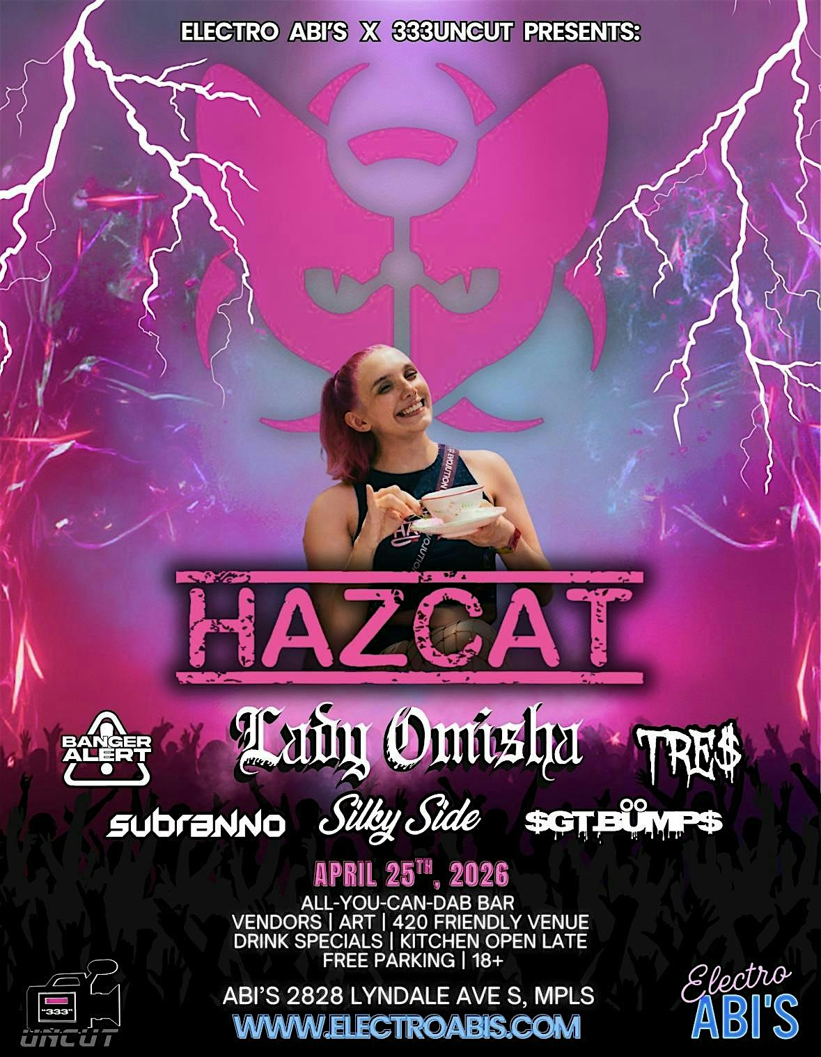 by admin27Feb Hazcat @ Electro Abi’s x 333Uncut at 2828 Lyndale Ave S – Minneapolis, MN Hazcat @ Electro Abi’s x 333Uncut at 2828 Lyndale Ave S – Minneapolis, MN 2 2 people viewed this event. Get ready to vibe with Electro Abi’s and 333Uncut dropping sick beats at Hazcat—live and lit! Tickets-RSVP Link Date And Time Saturday, April 25th, 2026 @ 09:00 PM Location 2828 Lyndale Avenue South, Minneapolis, MN 55408 Event Types Concert or PerformanceMusic Event Category MinneapolisMinnesota Share With Friends Facebook Twitter Linkedin Xing Pinterest Share This Post: