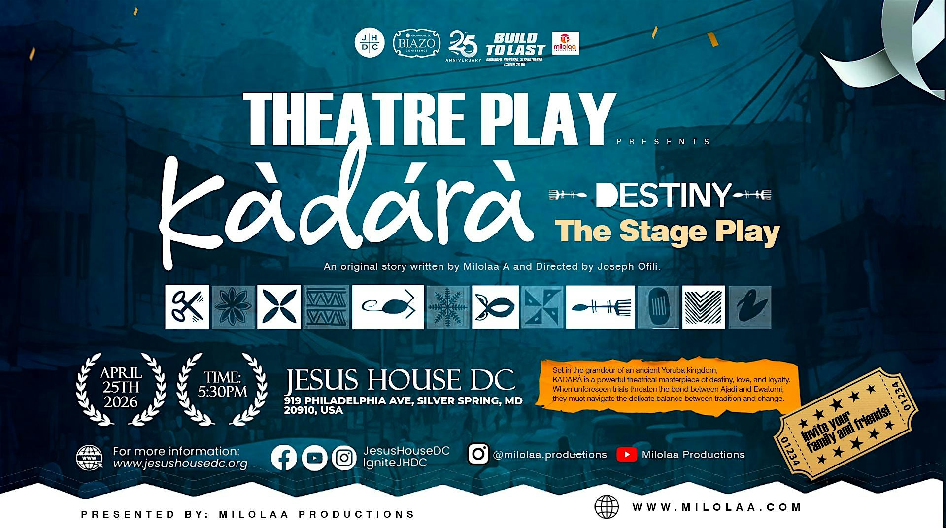 Kadara (BIAZO 2026 Theatre Play) at Jesus House DC – Silver Spring, MD Kadara (BIAZO 2026 Theatre Play) at Jesus House DC – Silver Spring, MD 5 5 people viewed this event. Get ready to dive into the world of Kadara The Stage Play and experience some epic live action up close! Tickets-RSVP Link Register for event Date And Time Saturday, April 25th, 2026 @ 05:00 PM Location 919 Philadelphia Avenue, Silver Spring, MD 20910 Event Types Concert or PerformancePerforming & Visual Arts Event Category MarylandSilver Spring Share With Friends Facebook Twitter Linkedin Xing Pinterest