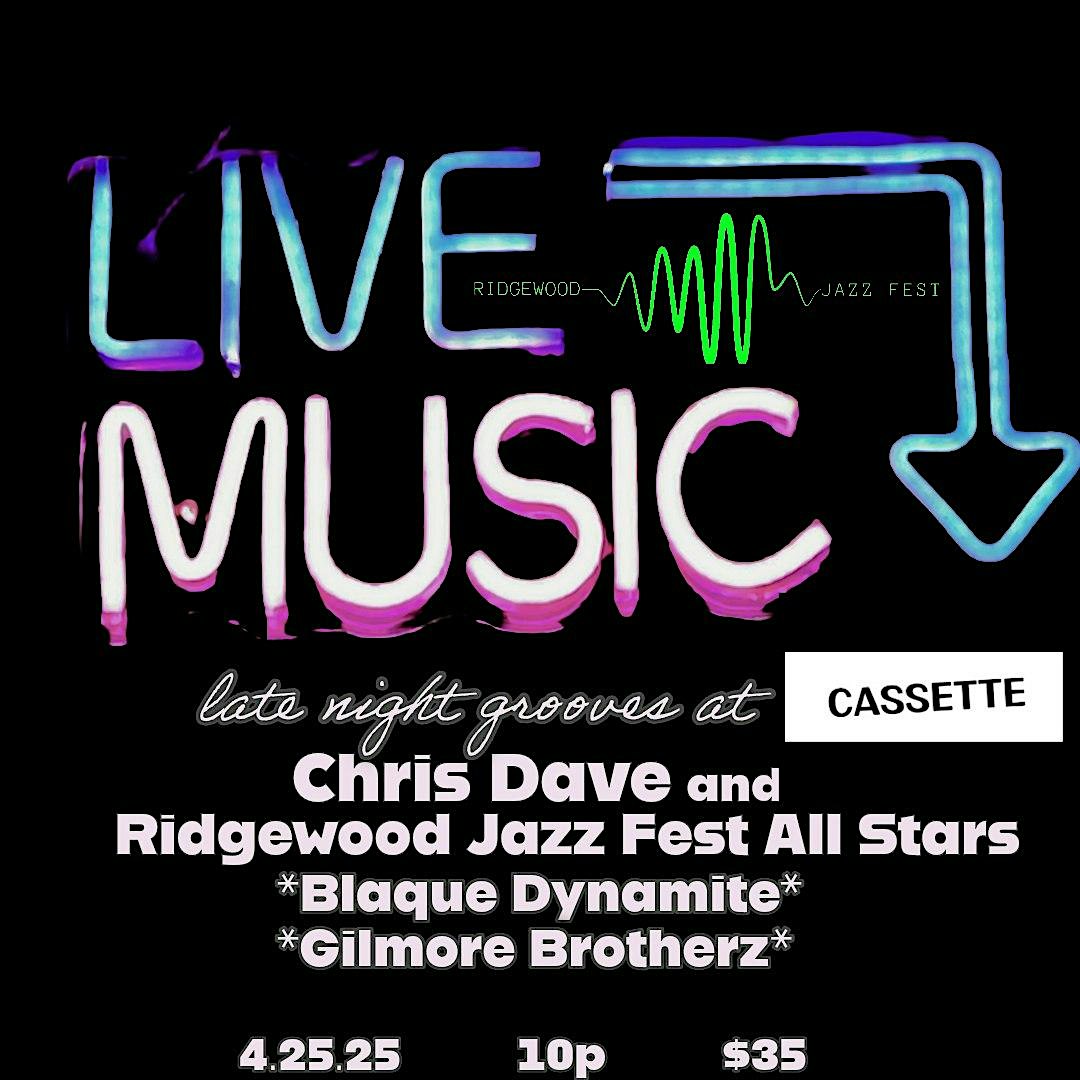 by admin27Feb Late Night Grooves CHRIS DAVE, BLAQUE DYNAMITE, GILMORE BROZ at Cassette – Queens, NY Late Night Grooves CHRIS DAVE, BLAQUE DYNAMITE, GILMORE BROZ at Cassette – Queens, NY 2 2 people viewed this event. Ridgewood Jazz Fest presents Late Night Sessions with some of today’s most exciting artists in an intimate undergound show. One night only! Tickets-RSVP Link Date And Time Saturday, April 25th, 2026 @ 10:00 PM Location 68-38 Forest Avenue, Queens, NY 11385 Event Types Concert or PerformanceMusic Event Category New YorkNew York City Share With Friends Facebook Twitter Linkedin Xing Pinterest Share This Post: