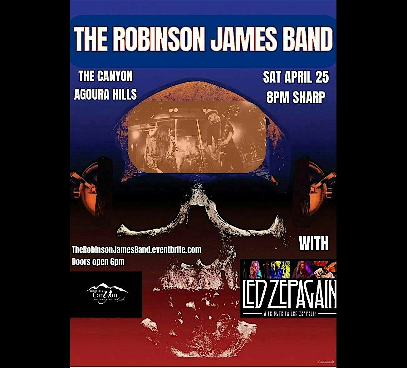 by admin27Feb Led Zepagain with The Robinson James Band at The Canyon – Agoura Hills – Agoura Hills, CA Led Zepagain with The Robinson James Band at The Canyon – Agoura Hills – Agoura Hills, CA 2 2 people viewed this event. Led Zepagain headlines The Canyon Agoura Hills, with support from The Robinson James Band at 8pm sharp, Prima Donna Rising 7pm, doors 6pm. Tickets-RSVP Link Date And Time Saturday, April 25th, 2026 @ 07:00 PM Location 28912 Roadside Drive, Agoura Hills, CA 91301 Event Types Concert or PerformanceMusic Event Category California Share With Friends Facebook Twitter Linkedin Xing Pinterest Share This Post: