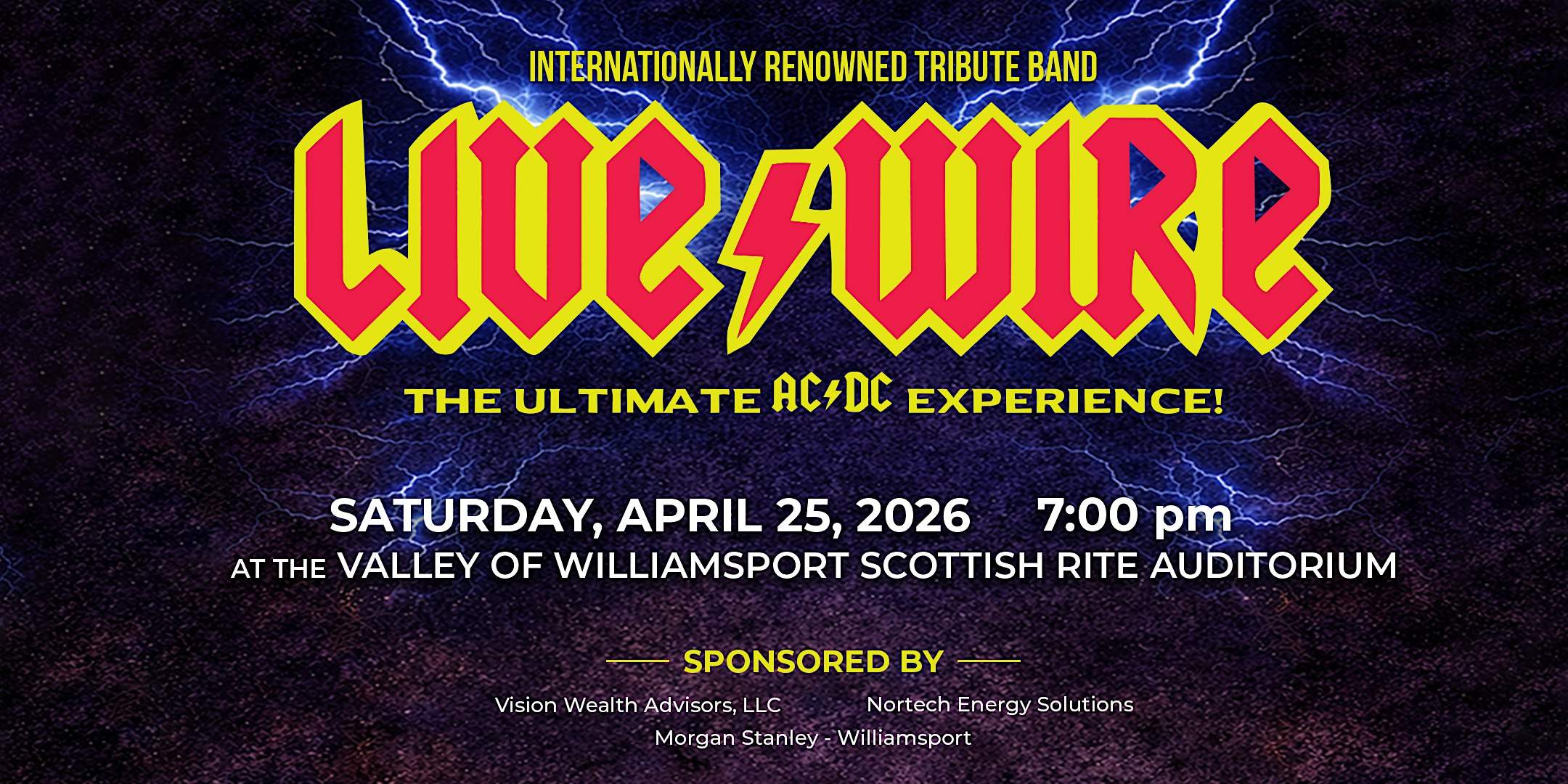 by admin13Feb LIVE WIRE – The Ultimate AC/DC Experience! at Williamsport Scottish Rite – Williamsport, PA LIVE WIRE – The Ultimate AC/DC Experience! at Williamsport Scottish Rite – Williamsport, PA 2 2 people viewed this event. Get ready to rock out like never before with LIVE WIRE – The Ultimate AC/DC Experience. Tickets-RSVP Link Date And Time Saturday, April 25th, 2026 11:00 PM (PST) Venue Williamsport Scottish Rite Location 348 Market Street, Williamsport, PA 17701 Event Types Concert or PerformanceMusic Event Category Pennsylvania Share With Friends Facebook Twitter Linkedin Xing Pinterest Share This Post: