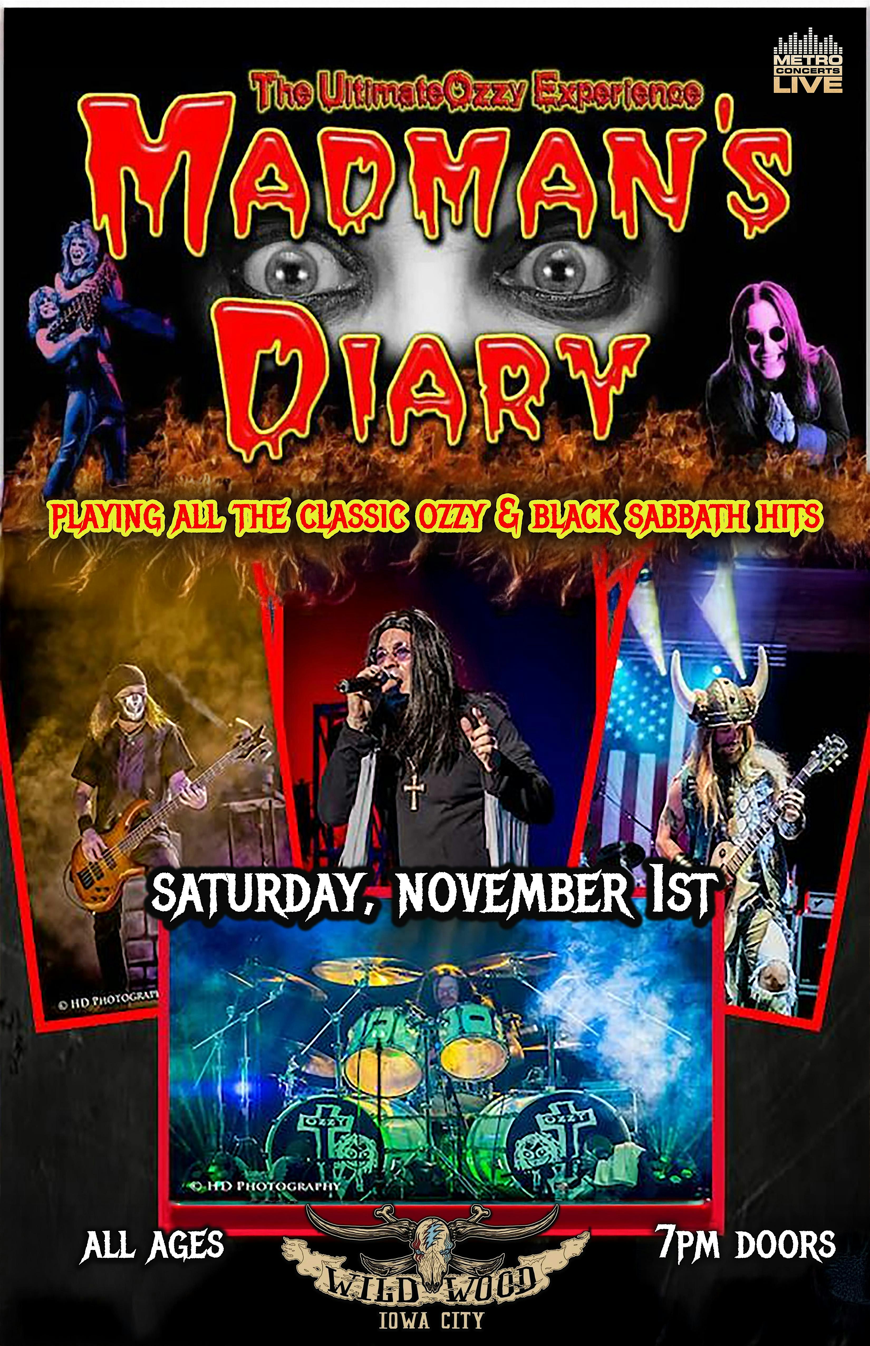 by admin13Feb Madman’s Diary – The Ultimate Ozzy Experience at Wildwood – Iowa City, IA Madman’s Diary – The Ultimate Ozzy Experience at Wildwood – Iowa City, IA 3 3 people viewed this event. Madman’s Diary – The Ultimate Ozzy Experience Tickets-RSVP Link Date And Time Saturday, April 25th, 2026 12:00 AM (PST) Venue Wildwood Location 4919 Walleye Dr. SE, Iowa City, IA 52240 Event Types Concert or PerformanceMusic Event Category Iowa Share With Friends Facebook Twitter Linkedin Xing Pinterest Share This Post: