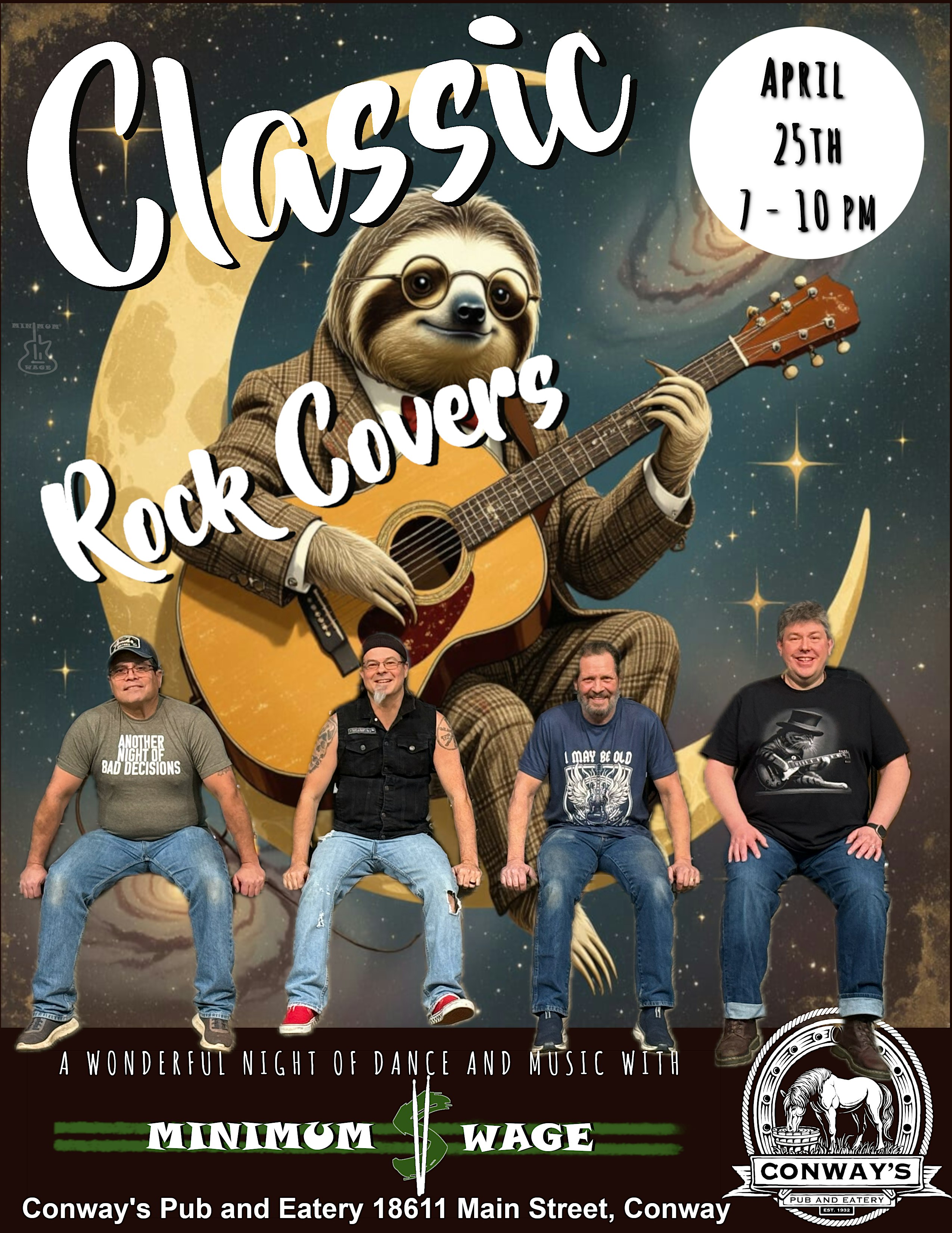 by admin24Feb Minimum Wage Band @ Conway’s Pub and Eatery at Conway’s Pub Eatery – Conway, WA Minimum Wage Band @ Conway’s Pub and Eatery at Conway’s Pub Eatery – Conway, WA 1 1 people viewed this event. Catch Minimum Wage Band live and loud at Conway’s Pub and Eatery for a night of good vibes and great tunes! Tickets-RSVP Link Date And Time Saturday, April 25th, 2026 07:00 PM (PST) Venue Conway's Pub Eatery Location 18611 Main Street, Conway, WA 98238 Event Types Concert or PerformanceMusic Event Category Washington Share With Friends Facebook Twitter Linkedin Xing Pinterest Share This Post: