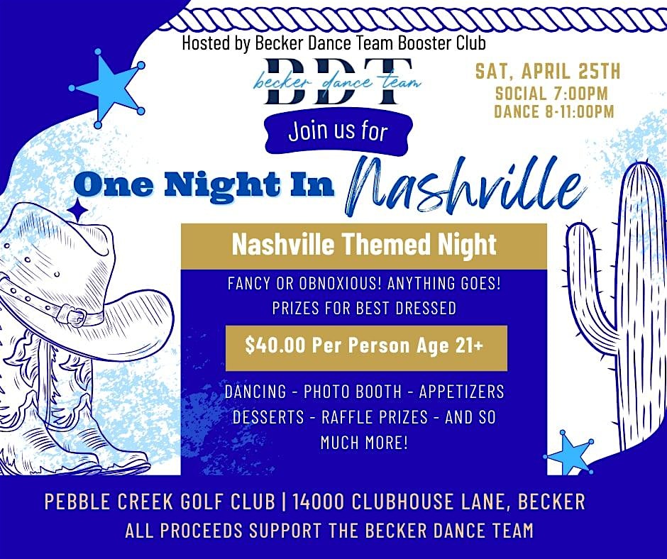 One Night in Nashville is the Becker Dance Team Boosters spring fundraiser. This fun, country -themed evening features a DJ, appetizers, desserts, raffles, silent auction and a “Best Dressed” contest while bringing the community together to support our dancers.