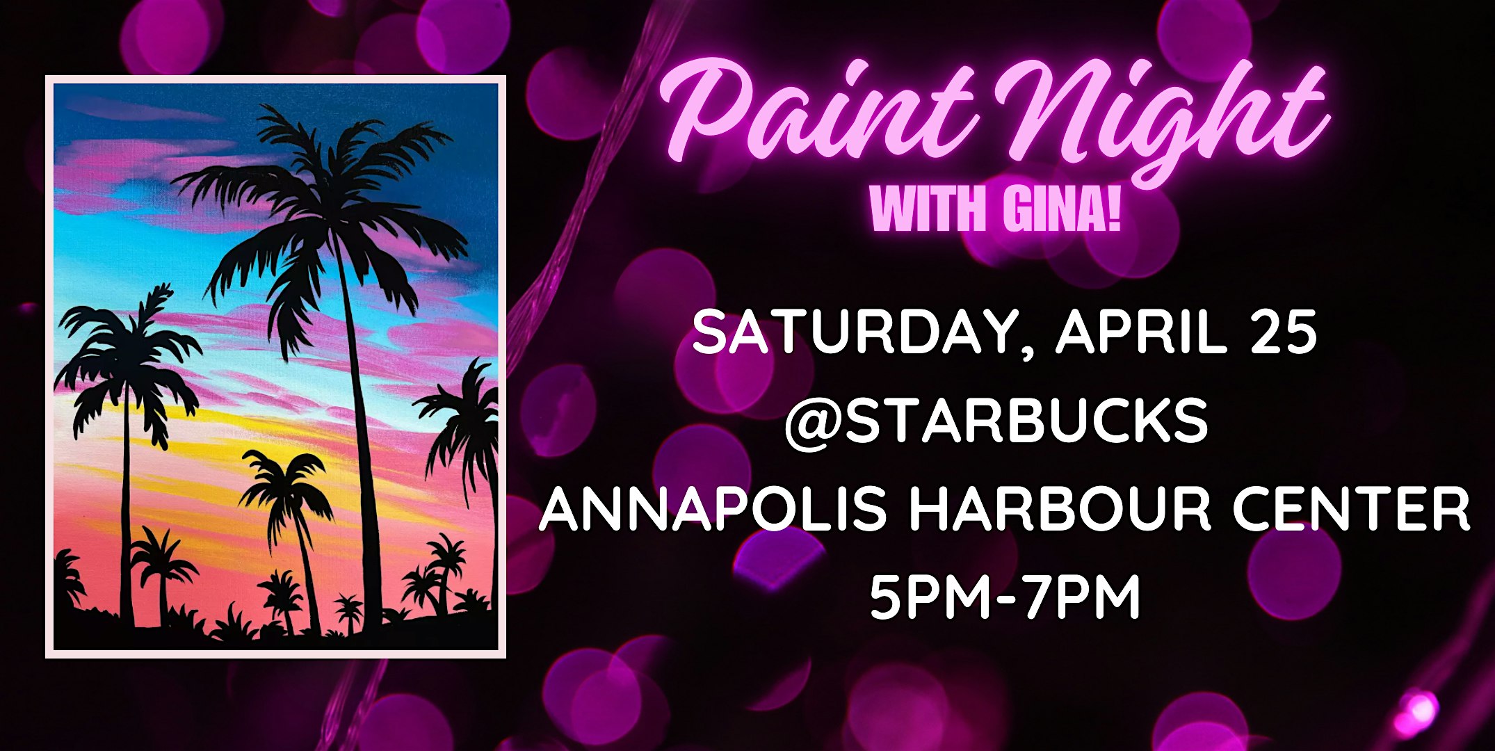 Come out for a fun night painting at Starbucks at Annapolis Harbour Center! Located next to Fresh Market. Get your creativity flowing as Gina guides you every step of the way. Put on an apron, relax, and follow along. Beginner-friendly. Customizable art. Gina will be available for support and a boost of encouragement!