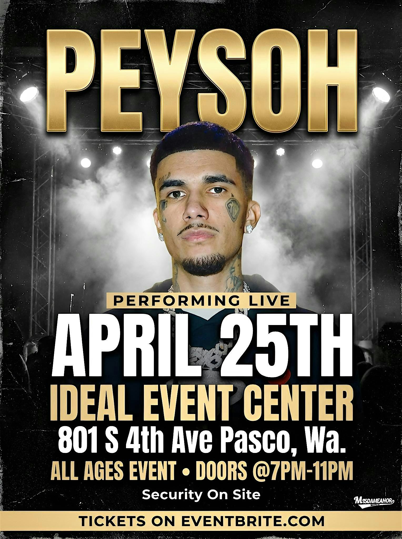 by admin27Feb Peysoh Performing Live at Ideal Event Center – Pasco, WA Peysoh Performing Live at Ideal Event Center – Pasco, WA 2 2 people viewed this event. Finally coming to Tri-Cities Highly requested Grammy-Award winning artist PEYSOH Tickets-RSVP Link Date And Time Saturday, April 25th, 2026 @ 07:00 PM Location 801 South 4th Avenue, Pasco, WA 99301 Event Types Concert or PerformanceMusic Event Category Washington Share With Friends Facebook Twitter Linkedin Xing Pinterest Share This Post: