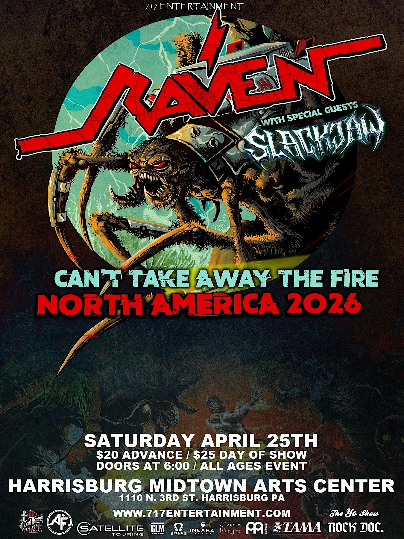 by admin13Feb Raven w/ Slackjaw at Harrisburg Midtown Arts Center – Harrisburg, PA Raven w/ Slackjaw at Harrisburg Midtown Arts Center – Harrisburg, PA 2 2 people viewed this event. Raven hits HMAC w/ thier “Can’t Take Away The Fire” Tour Tickets-RSVP Link Date And Time Saturday, April 25th, 2026 10:00 PM (PST) Venue Harrisburg Midtown Arts Center Location 1110 North 3rd Street, Harrisburg, PA 17102 Event Types Concert or PerformanceMusic Event Category Pennsylvania Share With Friends Facebook Twitter Linkedin Xing Pinterest Share This Post:
