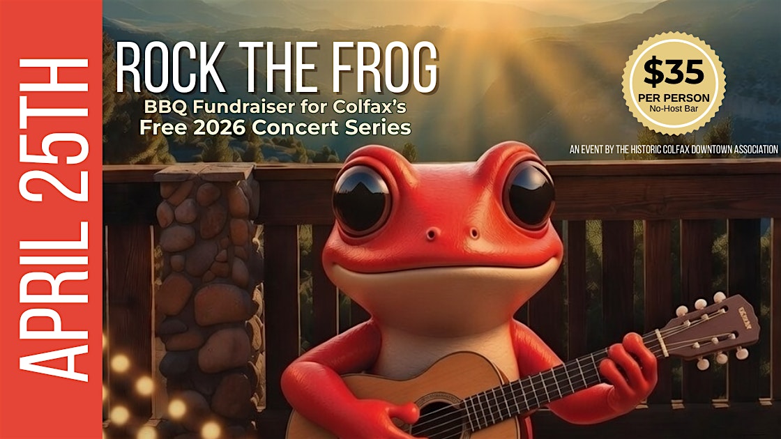Rock the Frog – A BBQ Fundraiser Supporting Free Downtown Colfax Concerts at 1007 CA-174 – Colfax, CA Rock the Frog – A BBQ Fundraiser Supporting Free Downtown Colfax Concerts at 1007 CA-174 – Colfax, CA 2 2 people viewed this event. Colfax event featuring BBQ and live music benefiting the Free 2026 Downtown Colfax Concert Series. Tickets required. Tickets-RSVP Link Register for event Date And Time Saturday, April 25th, 2026 @ 04:00 PM Location 1007 California 174, Colfax, CA 95713 Event Types Dinner or GalaFood & Drink Event Category California Share With Friends Facebook Twitter Linkedin Xing Pinterest