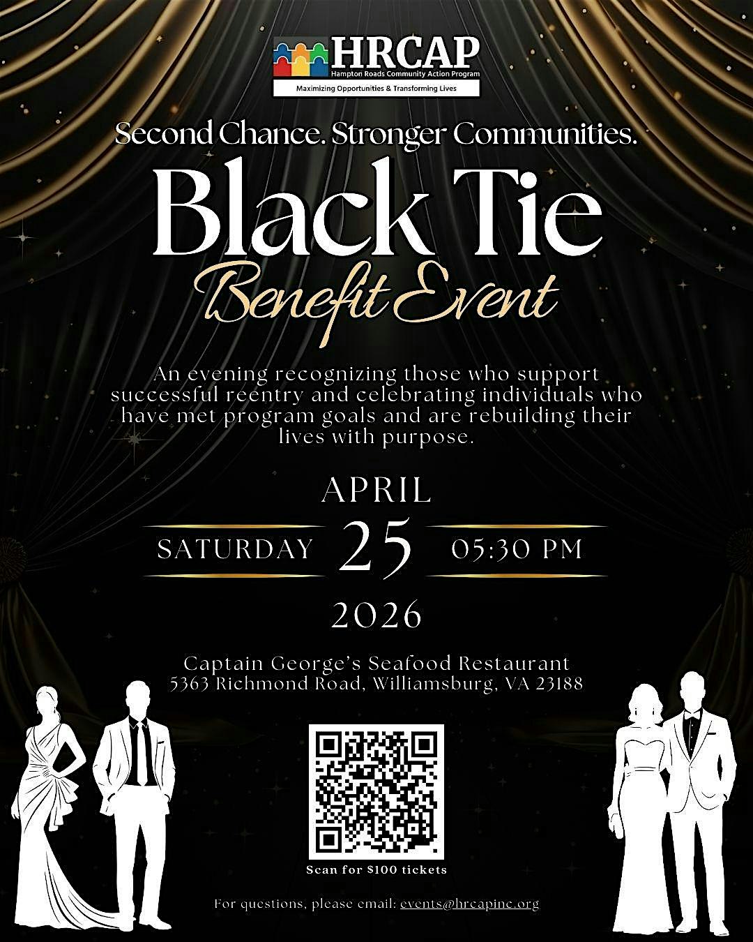 by admin23Feb Second Chance, Stronger Communities: A Black Tie Benefit at Captain George’s Seafood Restaurant – Williamsburg, VA Second Chance, Stronger Communities: A Black Tie Benefit at Captain George’s Seafood Restaurant – Williamsburg, VA 1 1 people viewed this event. Join us for the HRCAP Second Chance, Stronger Communities: A Black Tie Benefit – Tickets-RSVP Link Date And Time Saturday, April 25th, 2026 @ 05:00 PM Location 5363 Richmond Road, Williamsburg, VA 23188 Event Types OtherParty or Social Gathering Event Category Virginia Share With Friends Facebook Twitter Linkedin Xing Pinterest Share This Post: