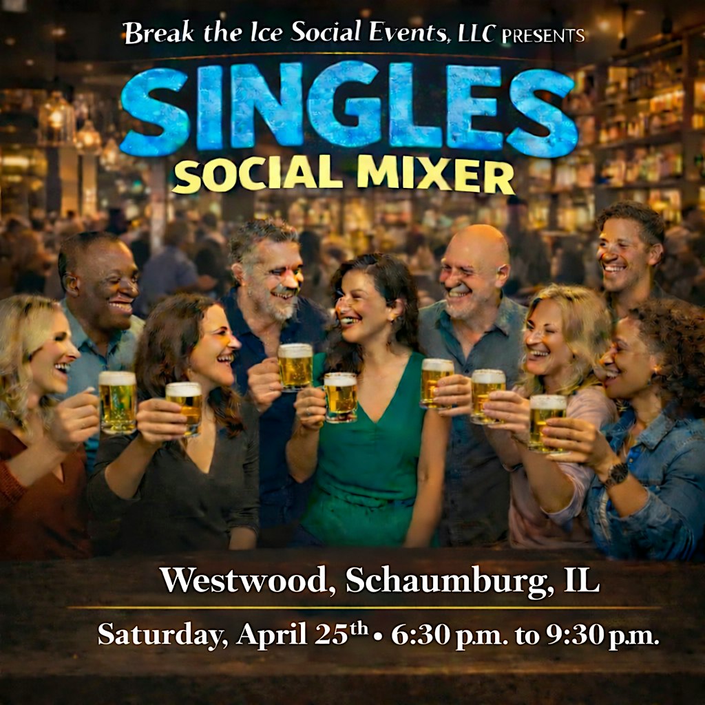 by admin27Feb Singles Social Mixer Schaumburg, IL Westwood Tavern at Westwood Tavern – Schaumburg, IL Singles Social Mixer Schaumburg, IL Westwood Tavern at Westwood Tavern – Schaumburg, IL 1 1 people viewed this event. These mixers are an excellent opportunity to meet new people in a fun environment. Leave the expectations at the door Tickets-RSVP Link Date And Time Saturday, April 25th, 2026 @ 06:00 PM Location 1385 North Meacham Road, Schaumburg, IL 60173 Event Types Food & DrinkParty or Social Gathering Event Category ChicagoIllinois Share With Friends Facebook Twitter Linkedin Xing Pinterest Share This Post: