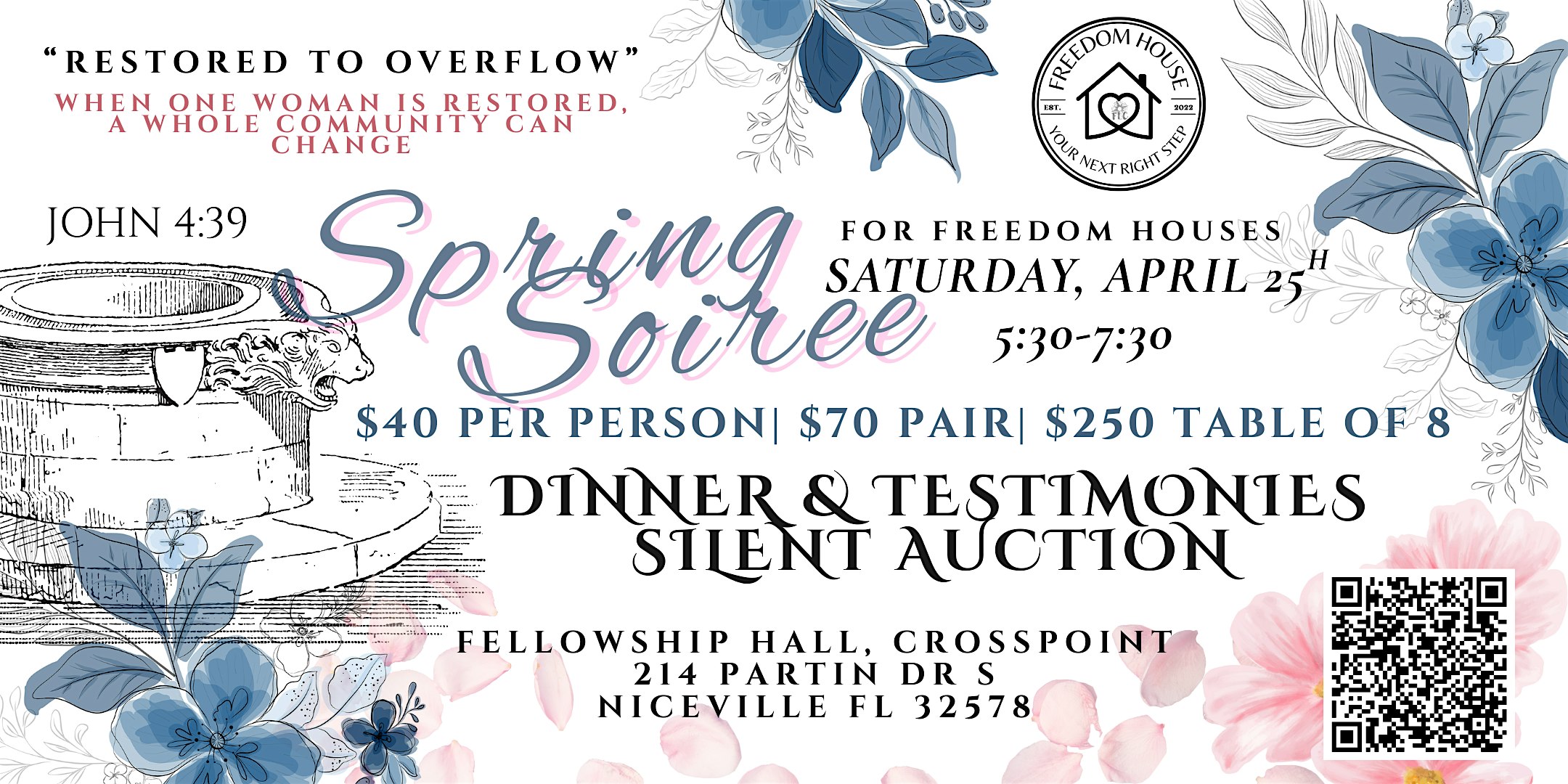 by admin27Feb Spring Soiree for Freedom Houses at Crosspoint, Niceville – Niceville, FL Spring Soiree for Freedom Houses at Crosspoint, Niceville – Niceville, FL 3 3 people viewed this event. Celebrate an evening of purpose as we support Freedom Life Compass and the transformative work of the Freedom Houses. Enjoy a delicious dinn Tickets-RSVP Link Date And Time Saturday, April 25th, 2026 @ 05:00 PM Location 214 Partin Drive South, Niceville, FL 32578 Event Types Charity & CausesParty or Social Gathering Event Category Florida Share With Friends Facebook Twitter Linkedin Xing Pinterest Share This Post: