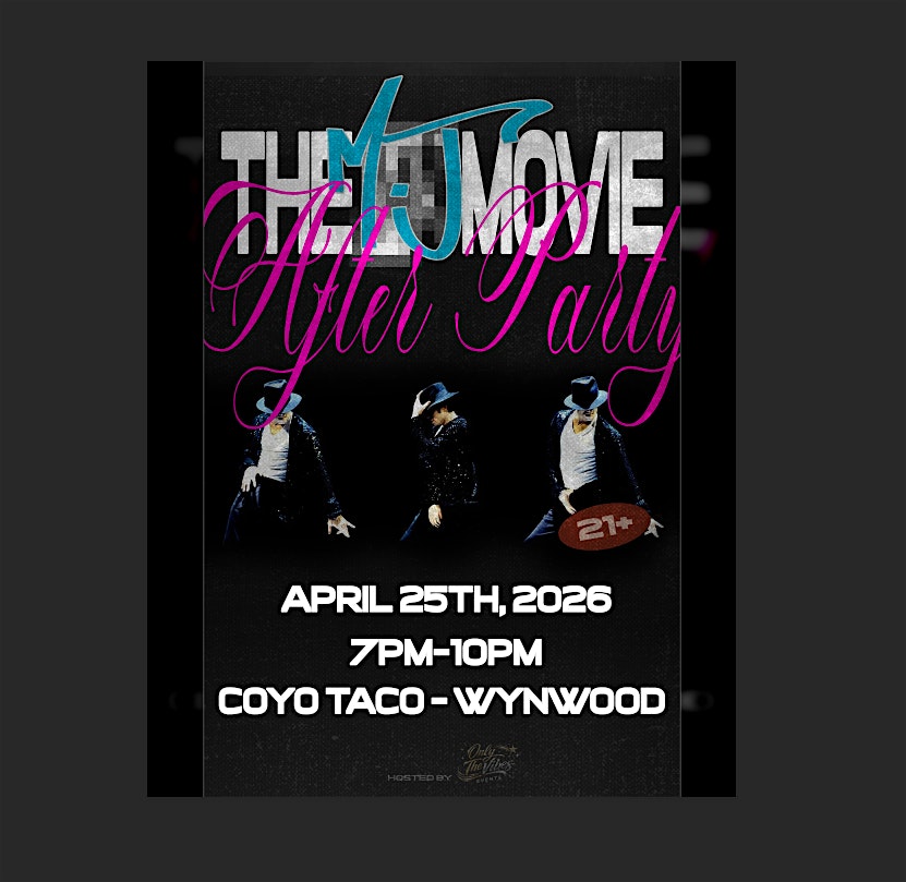 by admin27Feb THE MJ MOVIE AFTERPARTY at Coyo Taco – Miami, FL THE MJ MOVIE AFTERPARTY at Coyo Taco – Miami, FL 2 2 people viewed this event. Get ready to dance and vibe all night at THE MJ MOVIE AFTERPARTY—where the magic of Michael Jackson lives on! Tickets-RSVP Link Date And Time Saturday, April 25th, 2026 @ 07:00 PM Location 2320 Northwest 2nd Avenue, Miami, FL 33127 Event Types MusicParty or Social Gathering Event Category FloridaMiami Share With Friends Facebook Twitter Linkedin Xing Pinterest Share This Post: