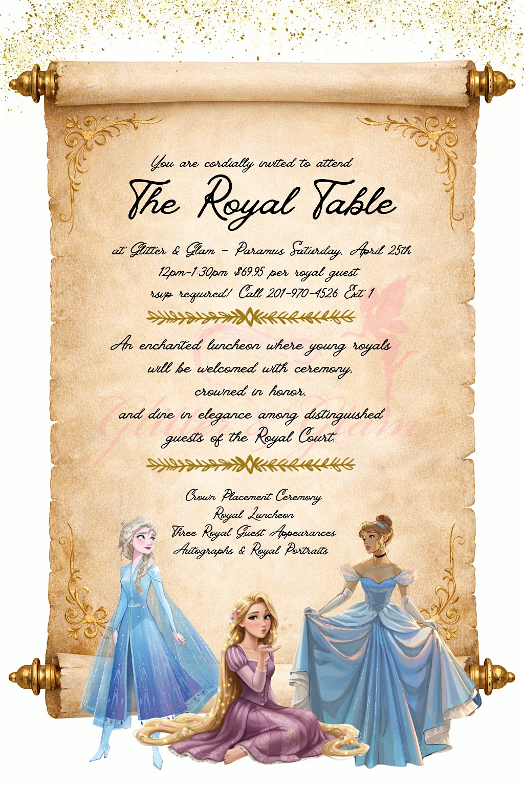The Royal Table! Paramus at Glitter & Glam – Paramus, NJ The Royal Table! Paramus at Glitter & Glam – Paramus, NJ 12 12 people viewed this event. Join us for a never seen before experience located right in Paramus! Tickets-RSVP Link Register for event Date And Time Saturday, April 25th, 2026 @ 12:00 PM Location Glitter & Glam 700 Paramus Park, Paramus, NJ 7652 Event Types Dinner or GalaFood & Drink Event Category New Jersey Share With Friends Facebook Twitter Linkedin Xing Pinterest
