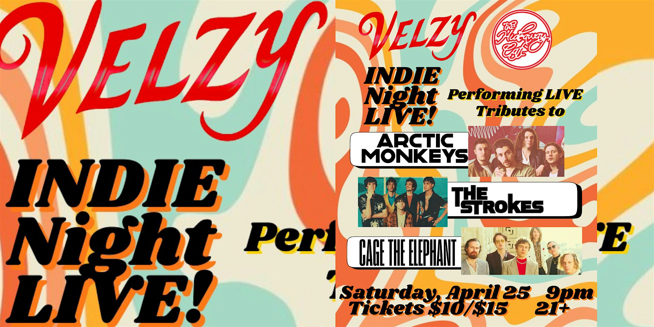 by admin27Feb VELZY Tribute Band (THE STROKES, ARCTIC MONKEYS & CAGE THE ELEPHANT) 04/25 at THE HIDEAWAY CAFE & LOUNGE – Riverside, CA VELZY Tribute Band (THE STROKES, ARCTIC MONKEYS & CAGE THE ELEPHANT) 04/25 at THE HIDEAWAY CAFE & LOUNGE – Riverside, CA 2 2 people viewed this event. VELZY presents a night of live tributes to THE STROKES, ARCTIC MONKEYS, and CAGE THE ELEPHANT at The Hideaway Cafe. Tickets-RSVP Link Date And Time Saturday, April 25th, 2026 @ 09:00 PM Location 3660 Mission Inn Avenue, Riverside, CA 92501 Event Types Concert or PerformanceMusic Event Category California Share With Friends Facebook Twitter Linkedin Xing Pinterest Share This Post: