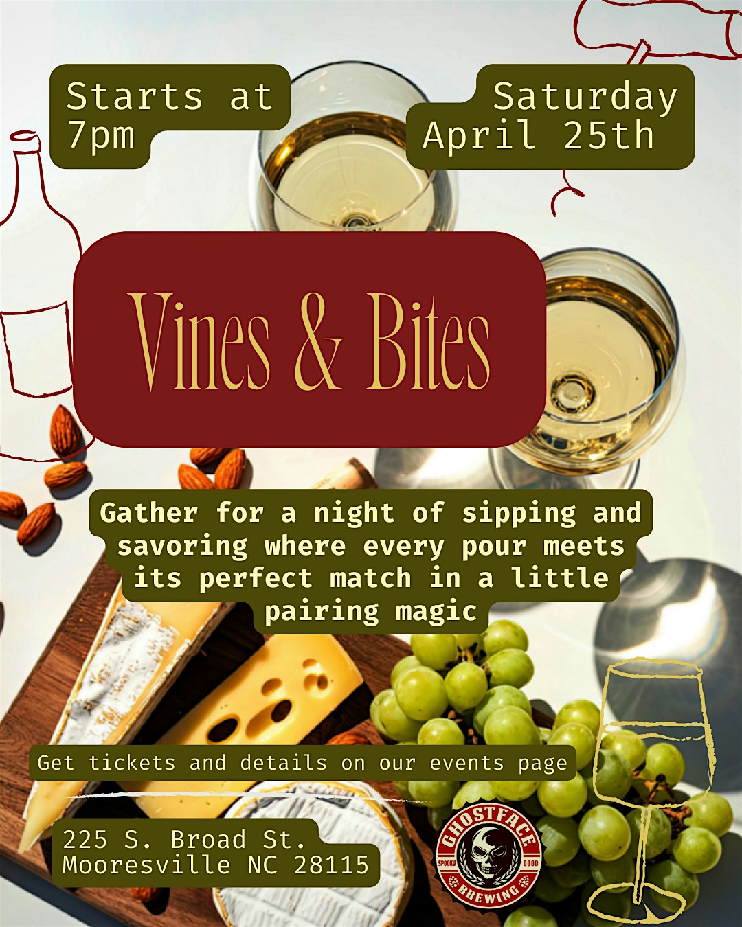 by admin24Feb Vine & Bites Wine Pairing at Beer Lab by Ghostface Brewing – Mooresville, NC Vine & Bites Wine Pairing at Beer Lab by Ghostface Brewing – Mooresville, NC 1 1 people viewed this event. A unique, immersed wine pairing experience! Tickets-RSVP Link Date And Time Saturday, April 25th, 2026 07:00 PM (PST) Venue Beer Lab by Ghostface Brewing Location 225 South Broad Street, Mooresville, NC 28115 Event Types Food & Drink Event Category North Carolina Share With Friends Facebook Twitter Linkedin Xing Pinterest Share This Post: