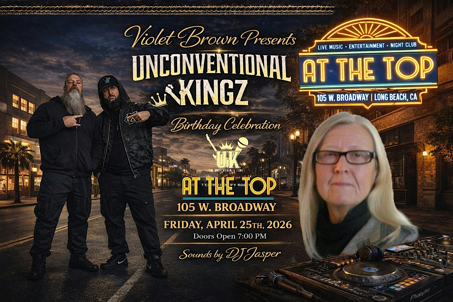 Violet Brown Presents Unconventional Kingz at At The Top – Long Beach, CA Violet Brown Presents Unconventional Kingz at At The Top – Long Beach, CA 4 4 people viewed this event. Violet Brown Presents,Unconventional Kingz: A high-energy, genre-blending, immersive show with exclusive vibes and strong crowd interaction. Tickets-RSVP Link Register for event Date And Time Saturday, April 25th, 2026 @ 07:00 PM Location 105 West Broadway, Long Beach, CA 90802 Event Types Concert or PerformanceMusic Event Category CaliforniaLong Beach Share With Friends Facebook Twitter Linkedin Xing Pinterest