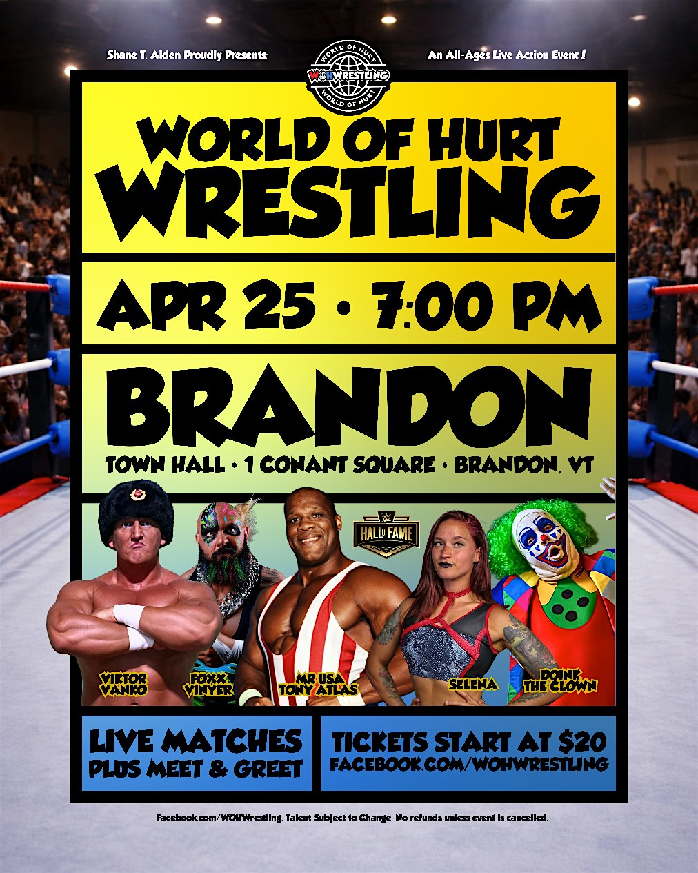 WOH WRESTLING returns to Brandon, VT on April 25th w WWE guest stars at Brandon Town Hall, Conant Square, Brandon, VT, USA – Brandon, VT