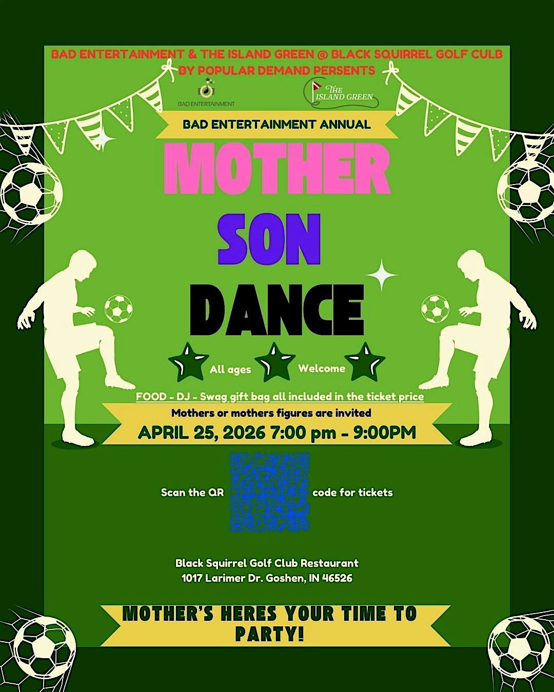 by admin13Feb Annual Bad Entertainment Mother Son Dance at Black Squirrel Golf Club – Goshen, IN Annual Bad Entertainment Mother Son Dance at Black Squirrel Golf Club – Goshen, IN 1 1 people viewed this event. Get ready for a night of great tunes from DJ Bad, silly fun, and unforgettable mother-son memories at the Annual Bad Entertainment Dance! Tickets-RSVP Link Date And Time Sunday, April 26th, 2026 11:00 PM (PST) Venue Black Squirrel Golf Club Location 1017 Larimer Drive, Goshen, IN 46526 Event Types MusicParty or Social Gathering Event Category Indiana Share With Friends Facebook Twitter Linkedin Xing Pinterest Share This Post: