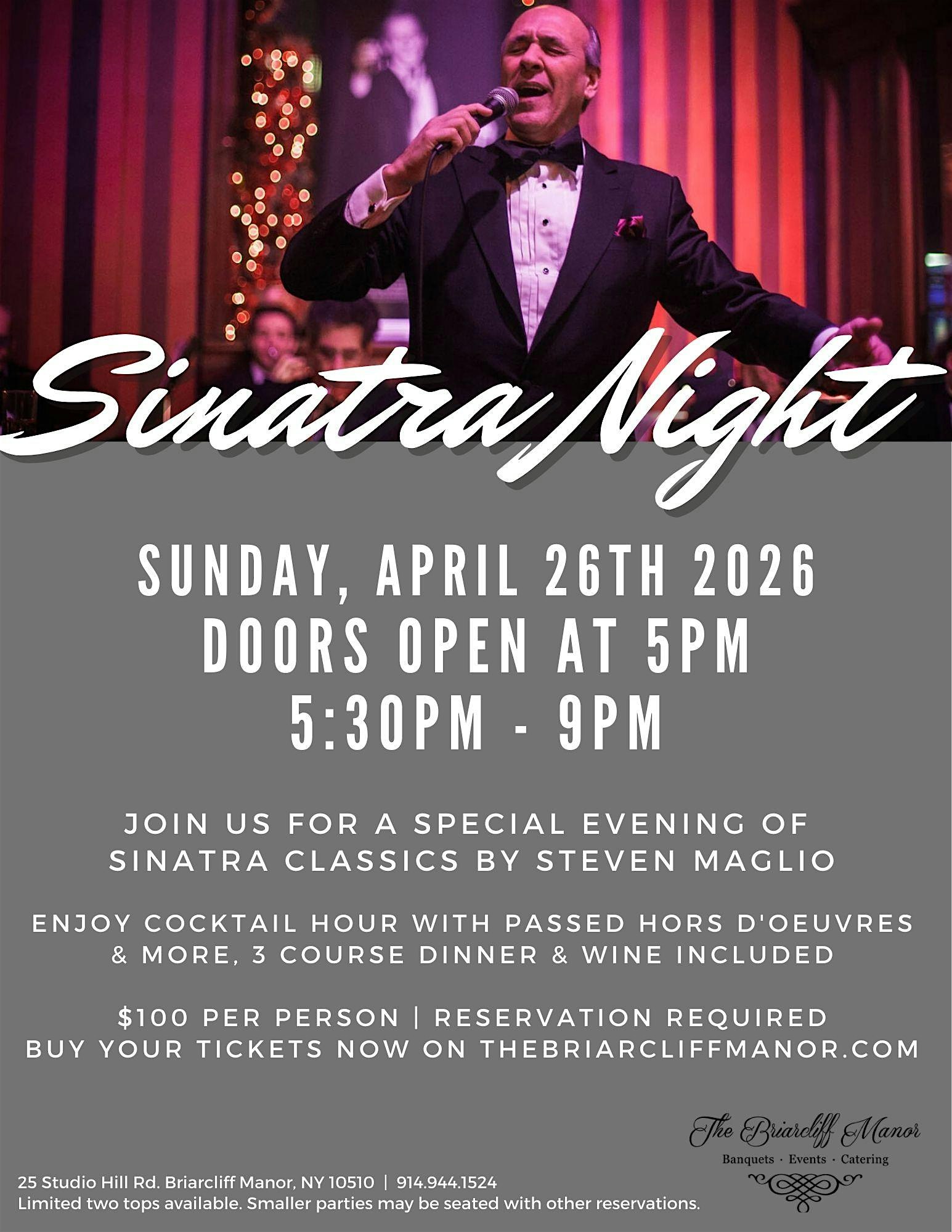 by admin24Feb April 26th Sinatra Night at The Briarcliff Manor – Briarcliff Manor, NY April 26th Sinatra Night at The Briarcliff Manor – Briarcliff Manor, NY 1 1 people viewed this event. Enjoy a special evening of Sinatra Classics by Steven Maglio! Gourmet cuisine, drinks, dancing & more! Tickets-RSVP Link Date And Time Sunday, April 26th, 2026 @ 05:00 PM Location 25 Studio Hill Rd., Briarcliff Manor, NY 10510 Event Types MusicOther Event Category New York Share With Friends Facebook Twitter Linkedin Xing Pinterest Share This Post: