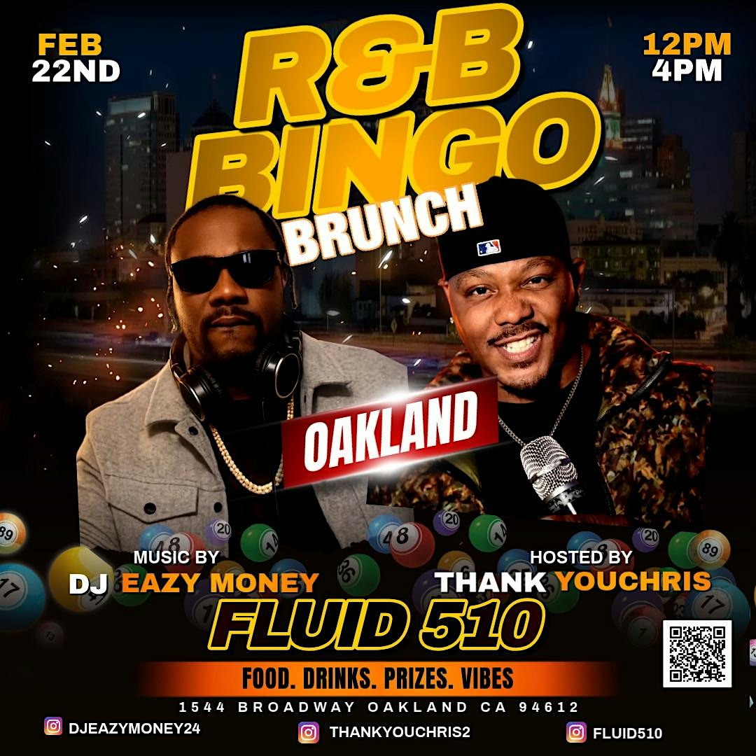 by admin27Feb BRUNCH R&B BiNGO OAKLAND! 4/26/26 R&B Vs Trap W/THANKYOUCHRIS @FLUID510 at Fluid510 – Oakland, CA BRUNCH R&B BiNGO OAKLAND! 4/26/26 R&B Vs Trap W/THANKYOUCHRIS @FLUID510 at Fluid510 – Oakland, CA 2 2 people viewed this event. R&B vs Trap Bingo BRUNCH Day Party with THANKYOUCHRIS & Eazy Money at FLUID510 – it’s gonna be lit! GET THE LOWEST PRICED TICKETS FIRST! Tickets-RSVP Link Date And Time Sunday, April 26th, 2026 @ 12:00 PM Location 1544 Broadway, Oakland, CA 94612 Event Types MusicParty or Social Gathering Event Category CaliforniaOakland Share With Friends Facebook Twitter Linkedin Xing Pinterest Share This Post: