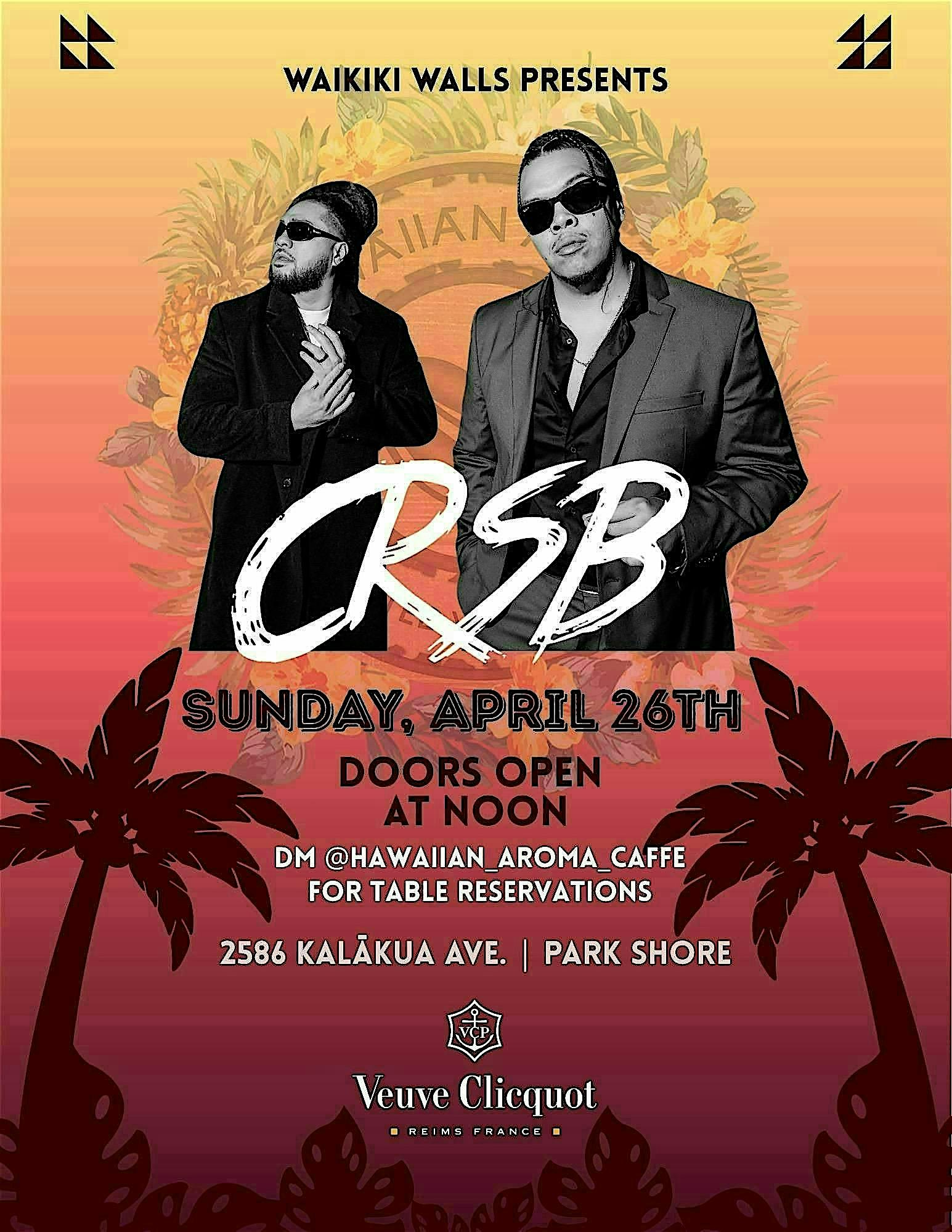 by admin24Feb CRSB @ Waikiki Walls Acoustic and DJ Set at Hawaiian Aroma Caffe at Waikiki Walls – Honolulu, HI CRSB @ Waikiki Walls Acoustic and DJ Set at Hawaiian Aroma Caffe at Waikiki Walls – Honolulu, HI 4 4 people viewed this event. Chill vibes at Waikiki Walls with CRSB spinning tunes live—acoustic jams meet DJ beats, don’t miss out! Tickets-RSVP Link Date And Time Sunday, April 26th, 2026 12:00 PM (PST) Venue Hawaiian Aroma Caffe at Waikiki Walls Location 2586 Kalākaua Avenue, Honolulu, HI 96815 Event Types Concert or PerformanceMusic Event Category HawaiiHonolulu Share With Friends Facebook Twitter Linkedin Xing Pinterest Share This Post: